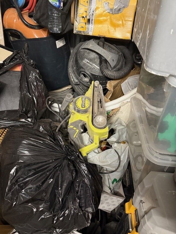 Builder's unit full of power tools and toolboxes. Some trolleys used for moving larger items. Ideal for independent contractors.