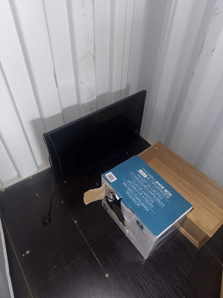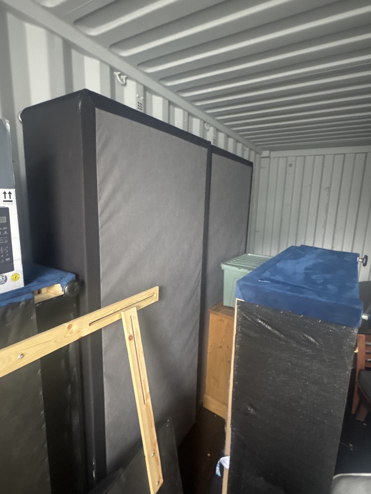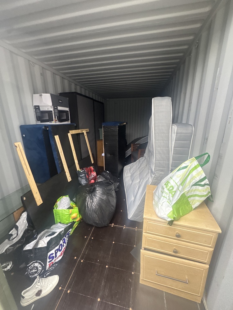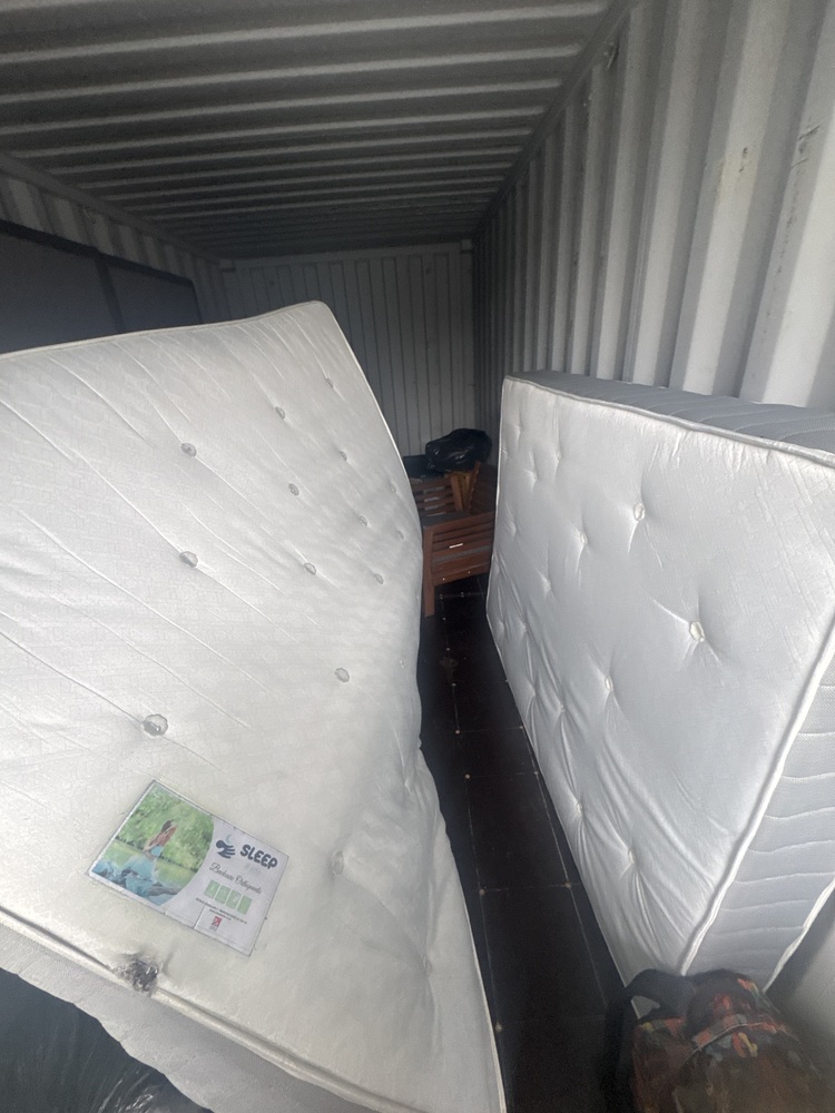 Auctioning the full contents of a storage container containing a selection of household and personal items. Included are a double bed with mattress and a king-size bed with mattress, both in good used condition. Also featured is a television, ideal for home entertainment, and a variety of trainers in assorted styles and sizes.