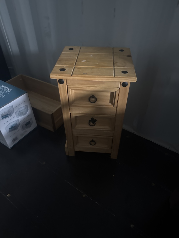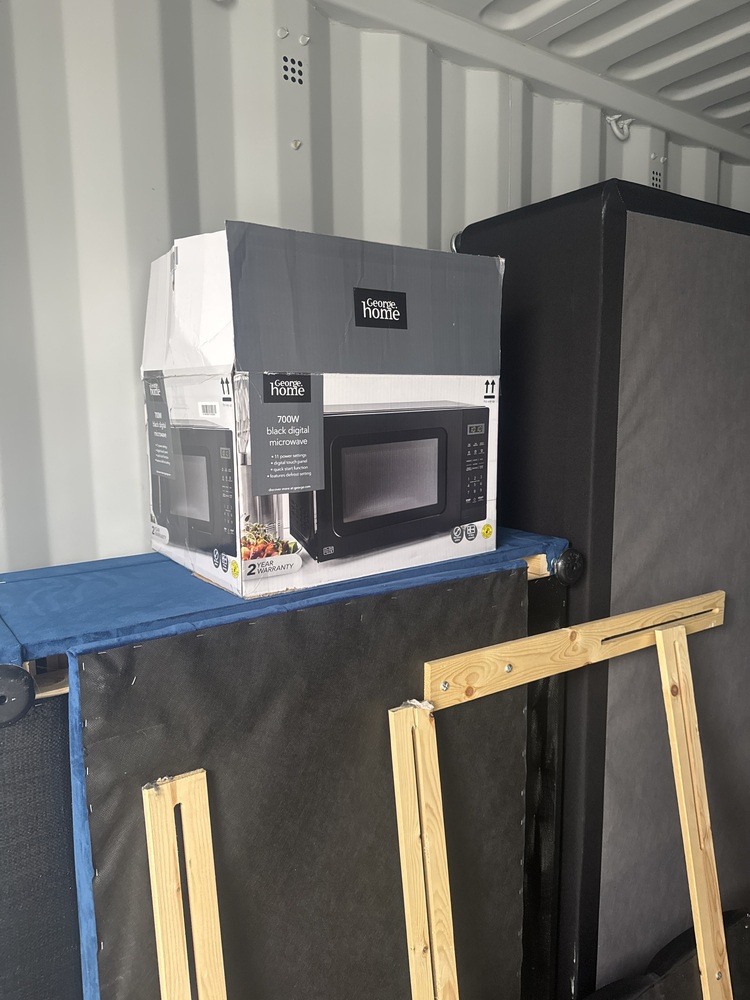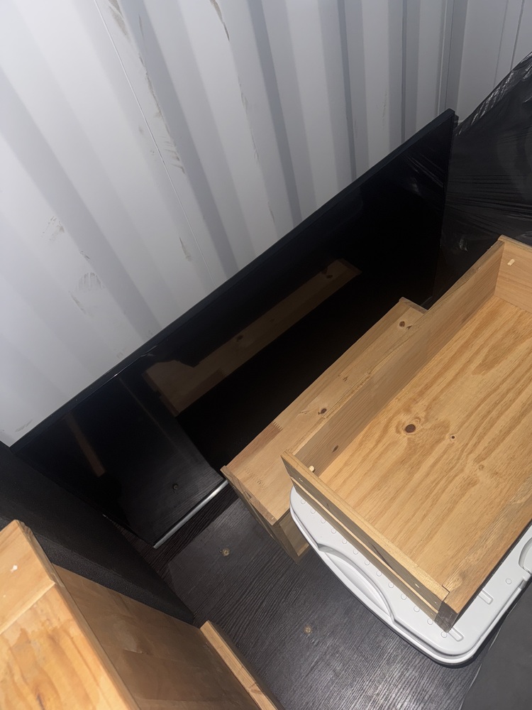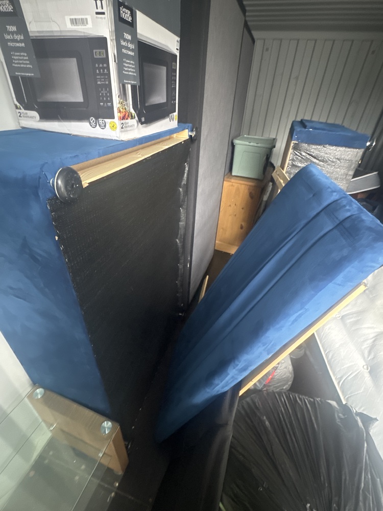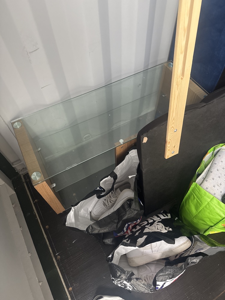 Auctioning the full contents of a storage container containing a selection of household and personal items. Included are a double bed with mattress and a king-size bed with mattress, both in good used condition. Also featured is a television, ideal for home entertainment, and a variety of trainers in assorted styles and sizes.