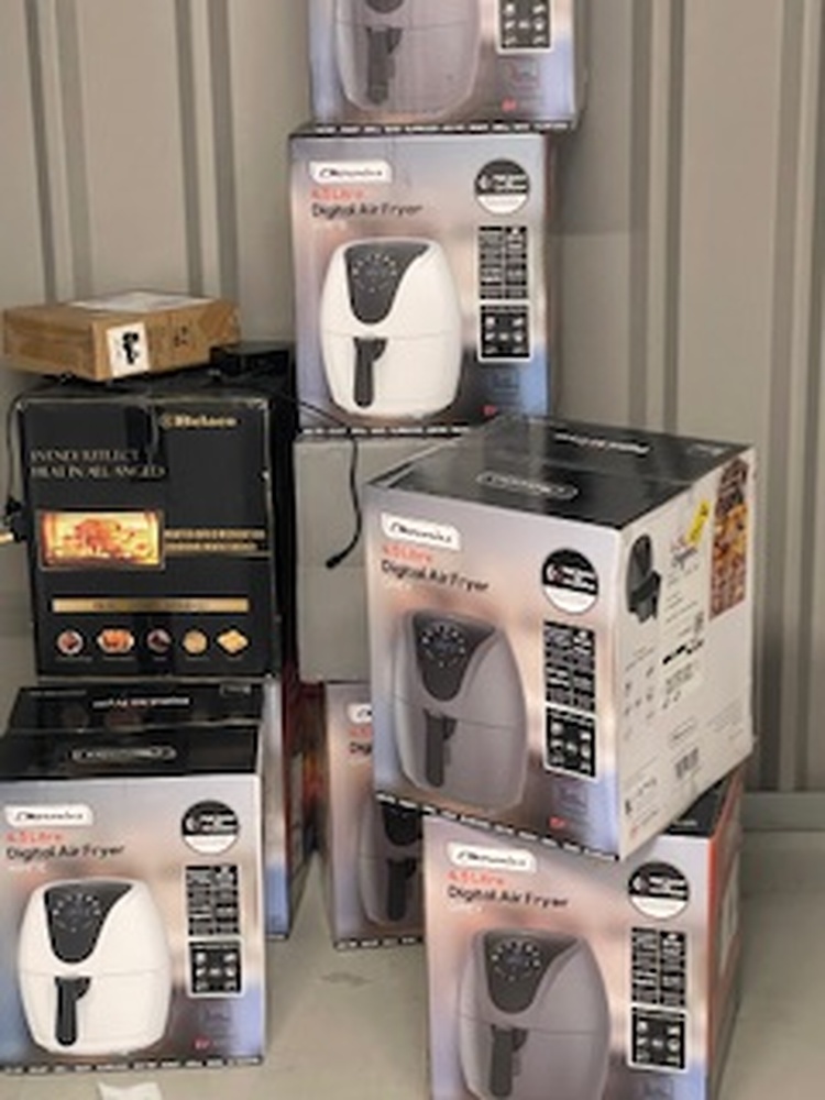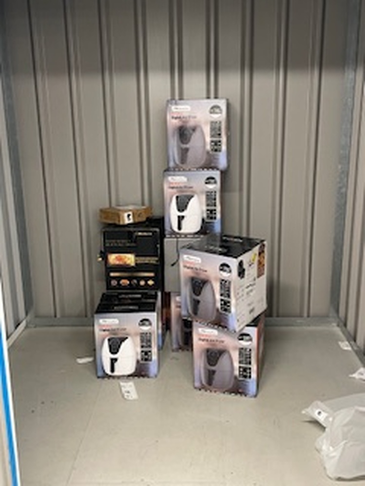 Unit size is 7 x 6 feet and the unit appears to contain some brand new sealed Air Fryers, around 7-9 in total