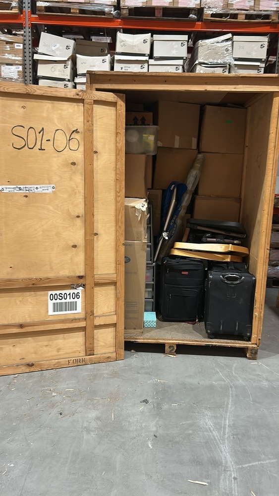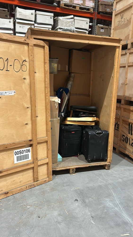 Storage unit with various items. There seems to be 2 suitcases and 2 plastic storage drawers. There are also multiple boxes.