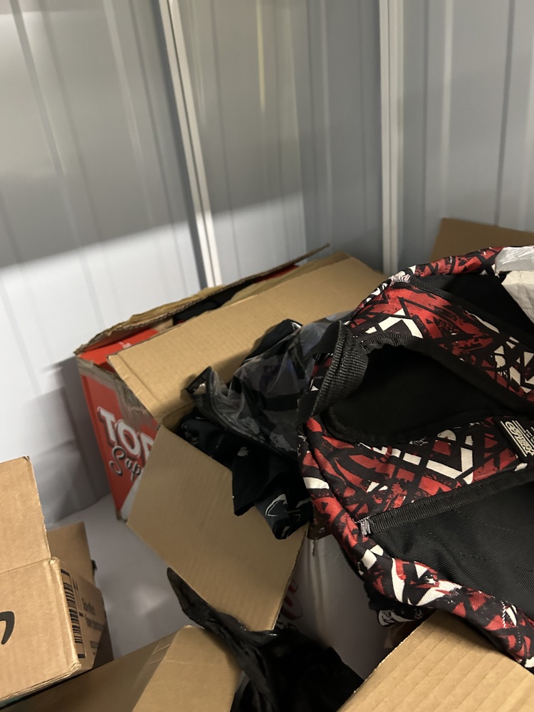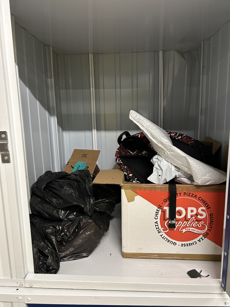 This locker unit contains the following; Two plastic bags and three boxes of personal items .