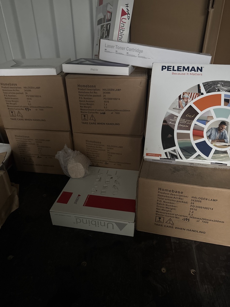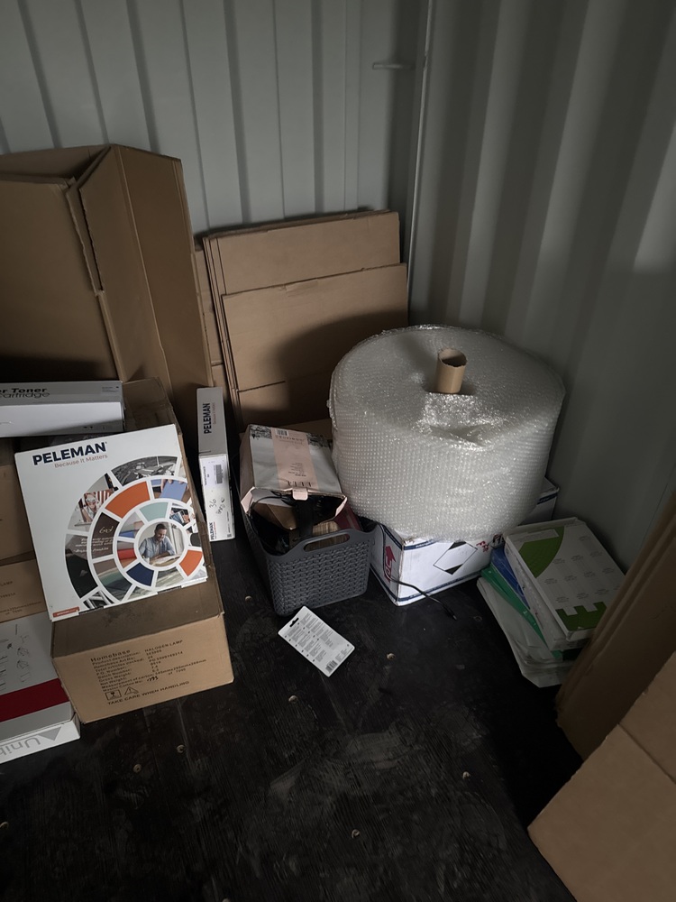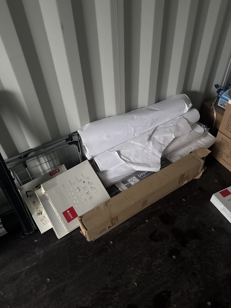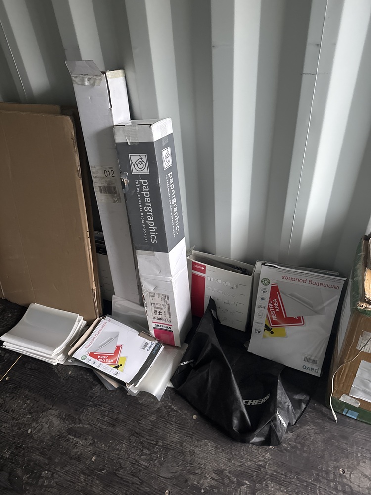contents of a storage container ideal for office, packaging, or home improvement needs. Includes a large supply of printing paper suitable for everyday use or professional projects. A collection of laminate sheets perfect for flooring, furniture, or craft applications. Multiple halogen lamps, ready to brighten any space with high-quality lighting. Also included are cardboard sheets and bubble wrap, ideal for safe packaging, shipping, or storage.
