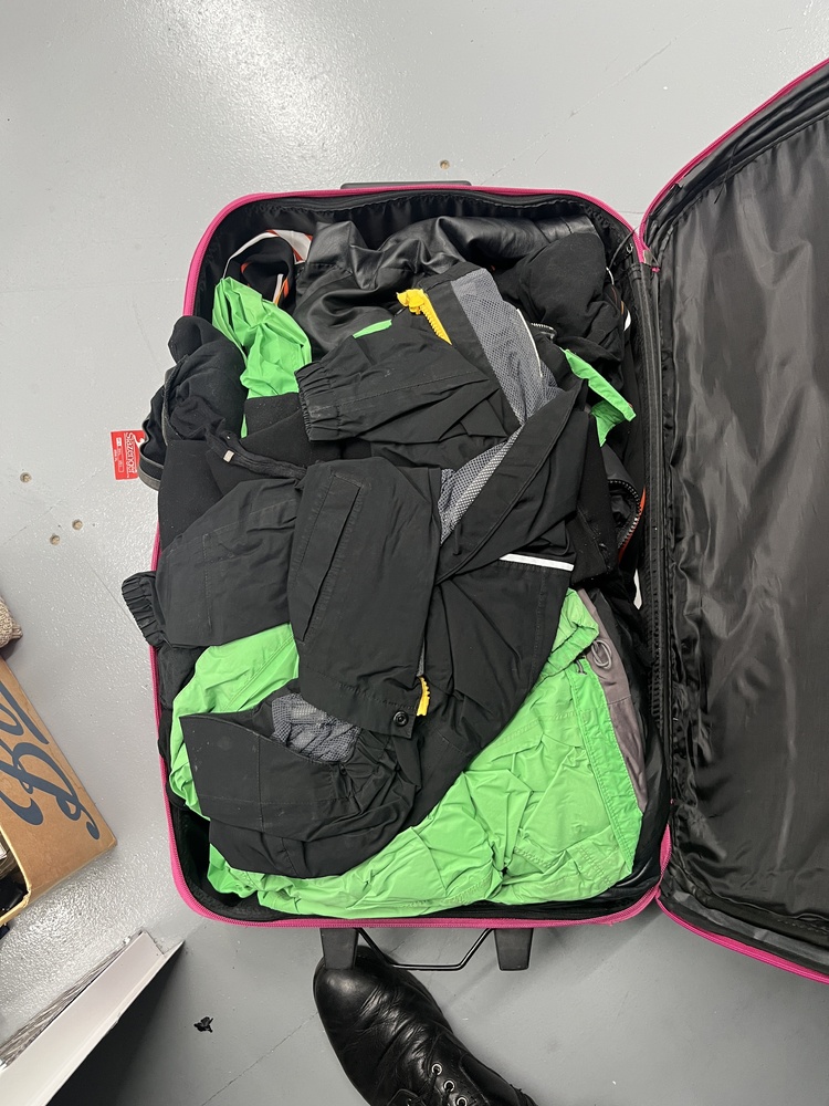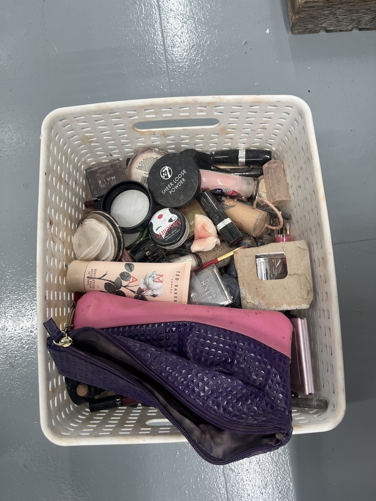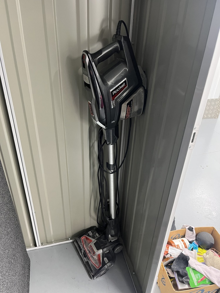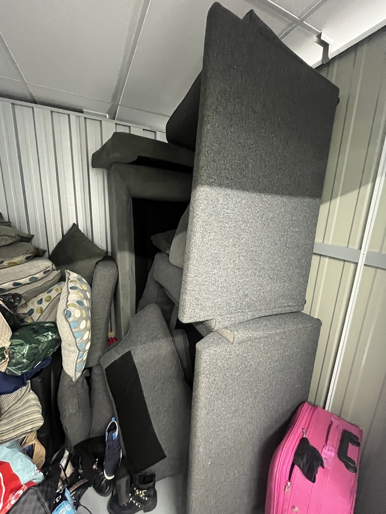 Small 50sqft with various assortments of clothing and shoes. Also contains 2 sofas and all the cushions, as well as a television all in good condition.