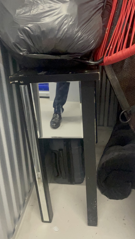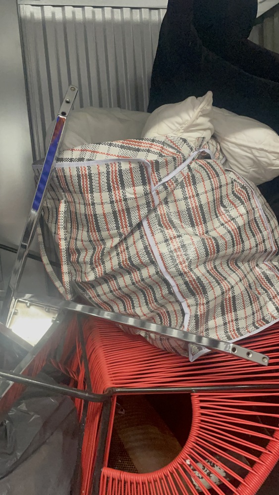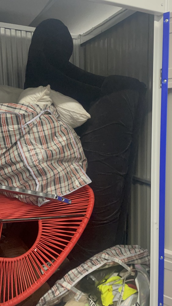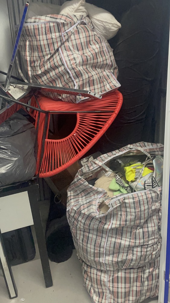 The 25 square-foot unit had one big red Wicca chair, one side table cabinets, two seater sofa, an outdoor fire pit, one small suitcase, and two bags of unknown personal items