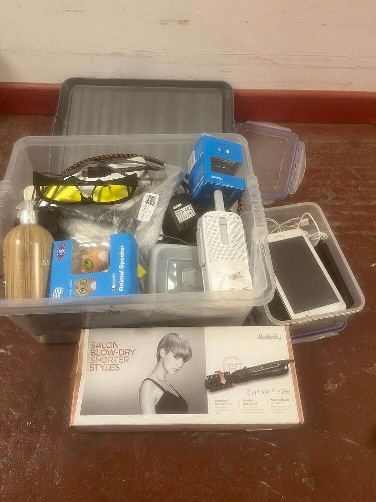 plastic box of cables/tablet/bluetooth speakers
