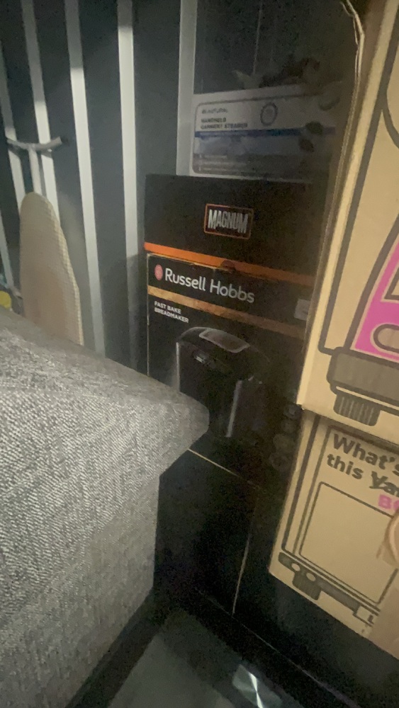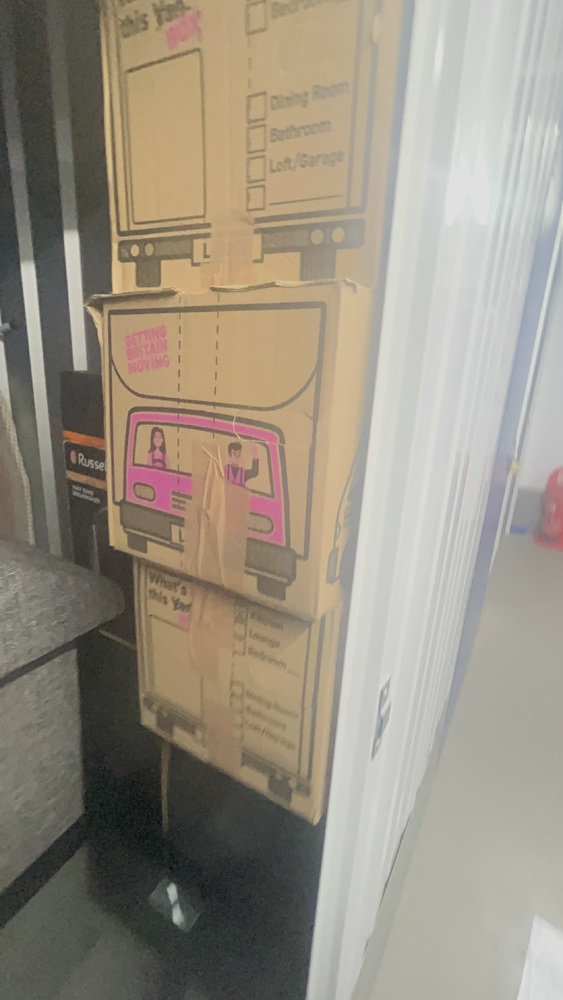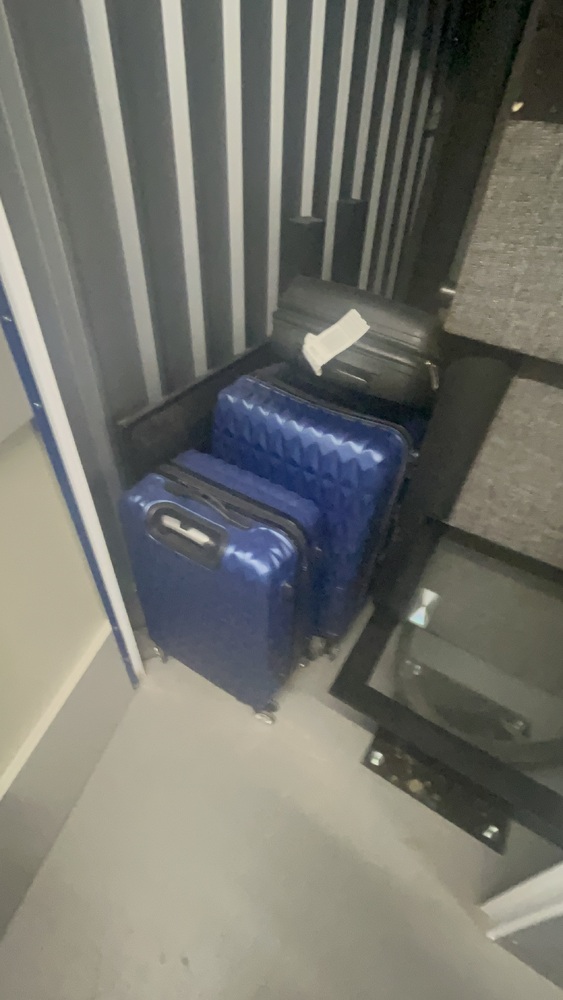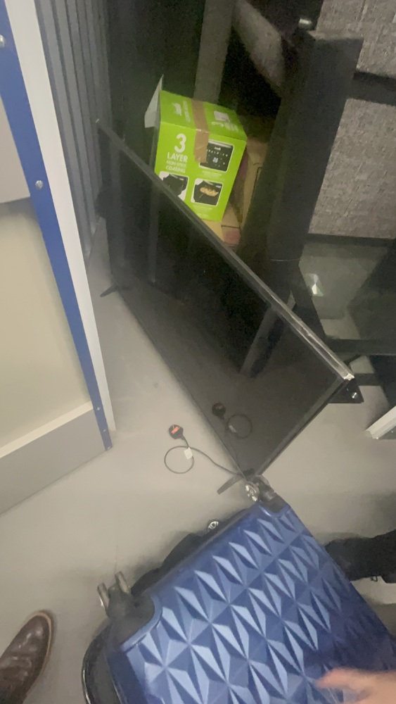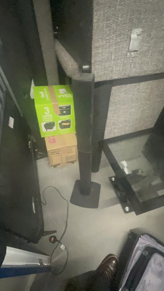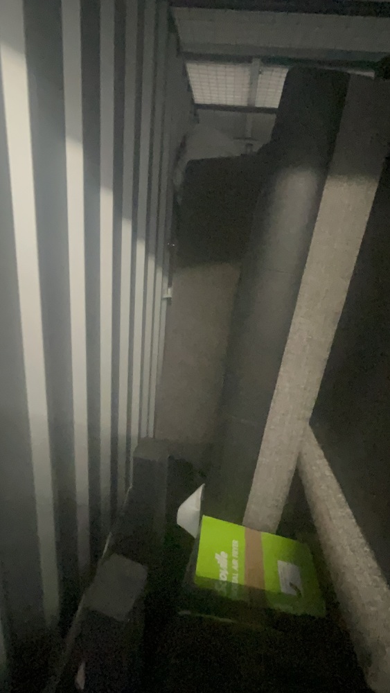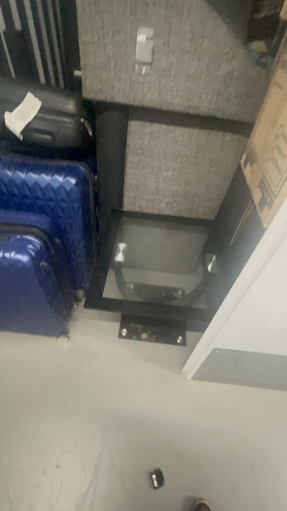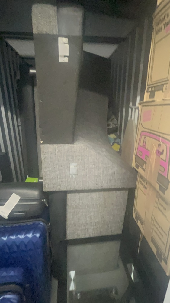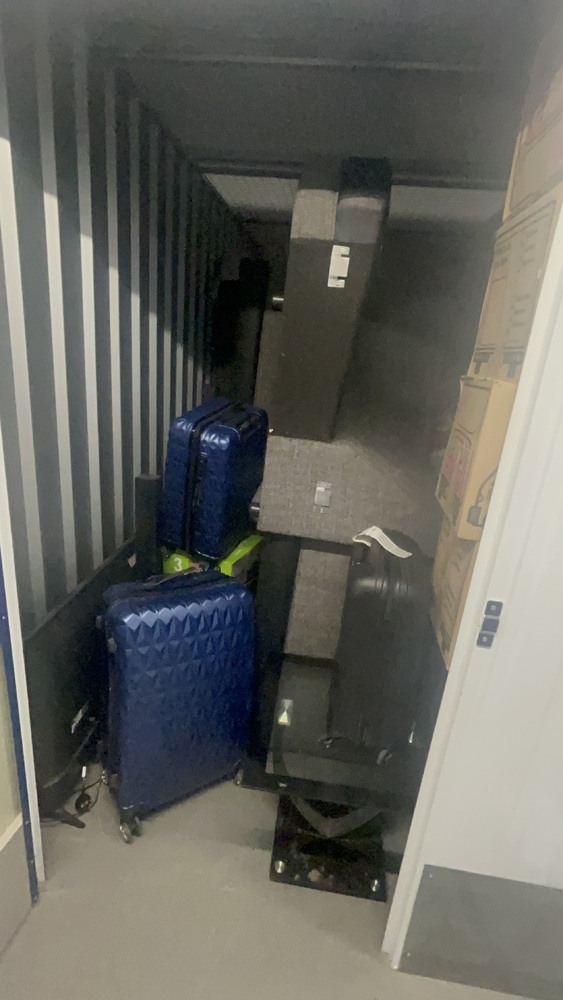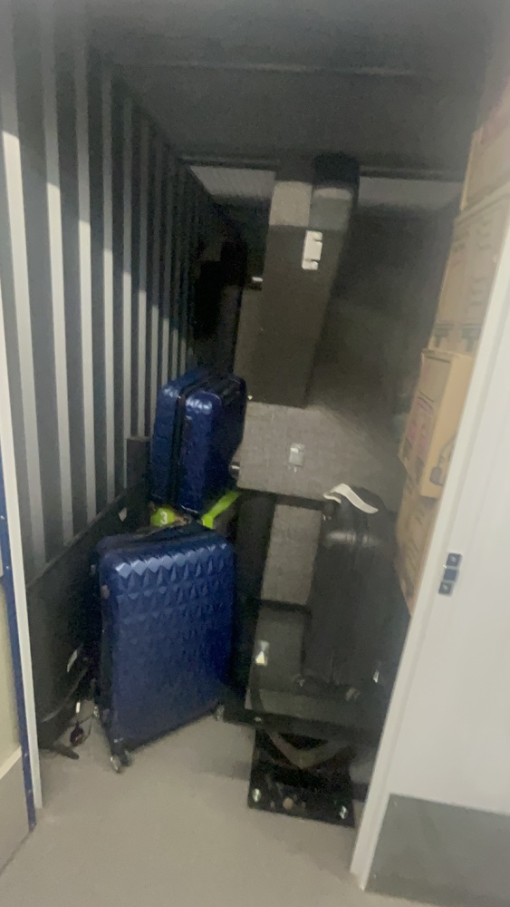 Unit has household items, corner side. Large LG TV. Suitcases either closed. Boxes inside unit. Coffee table.
