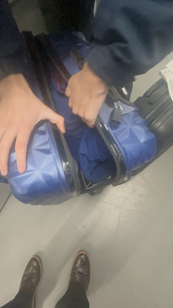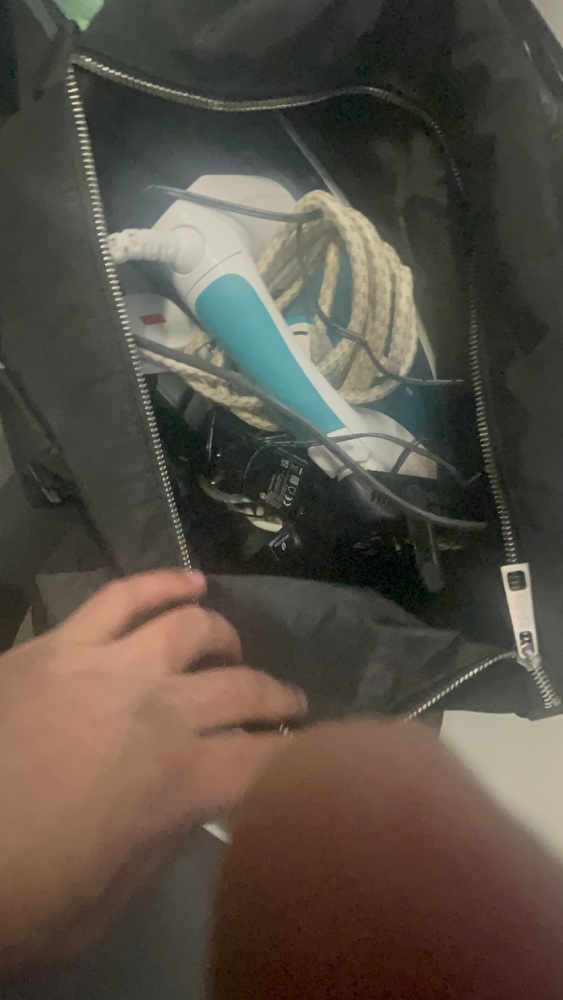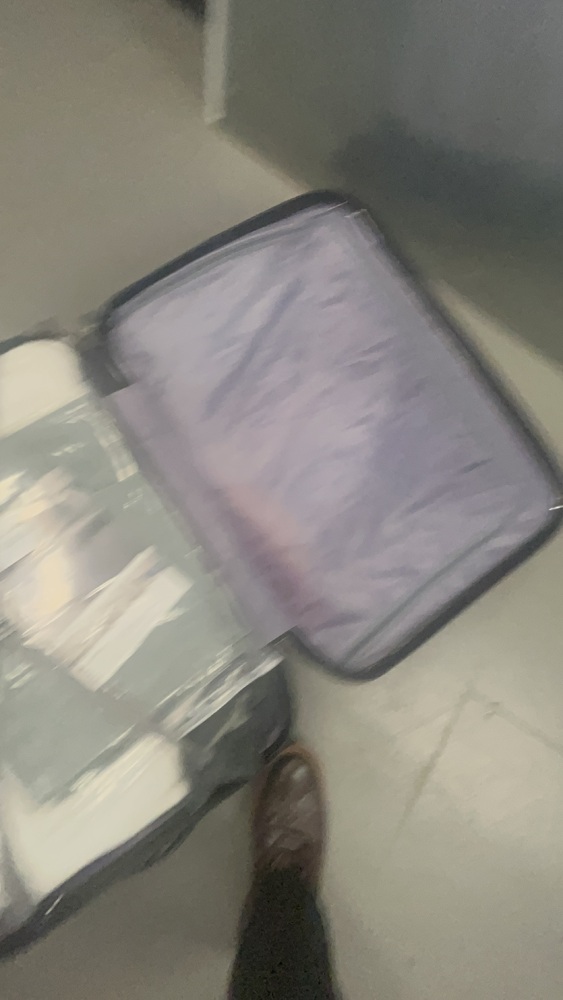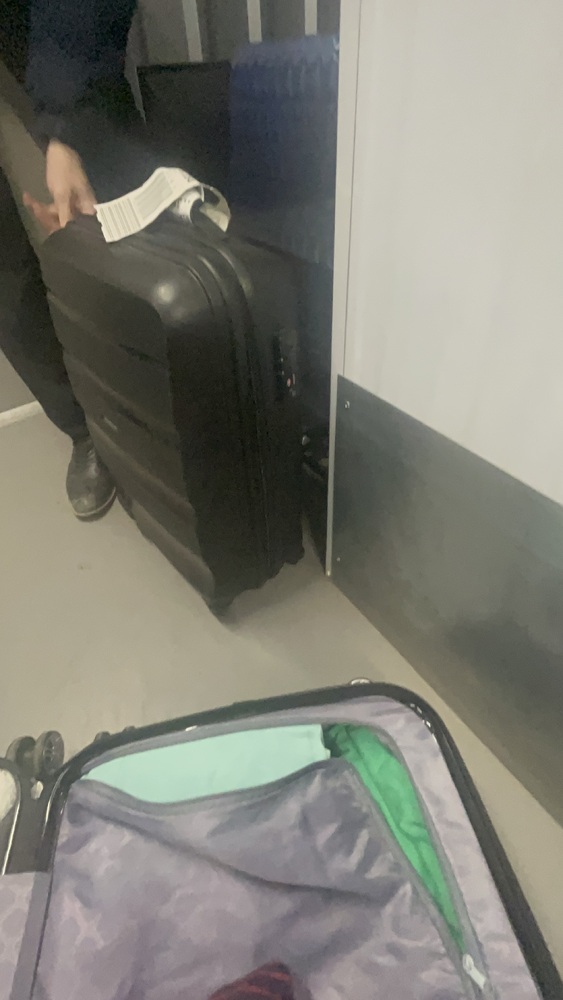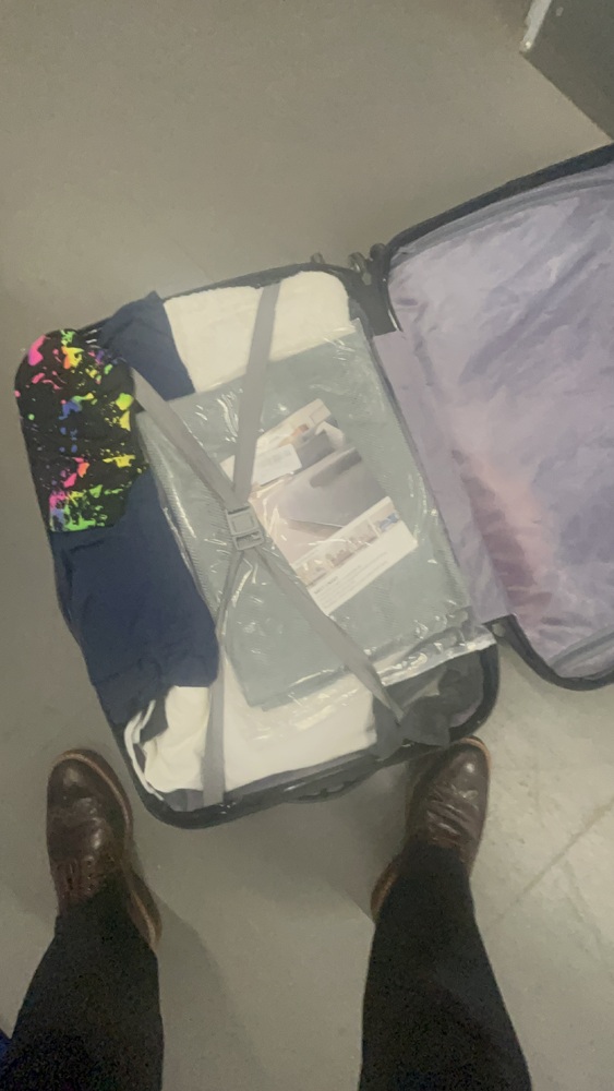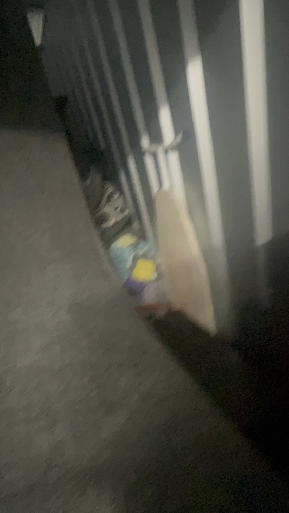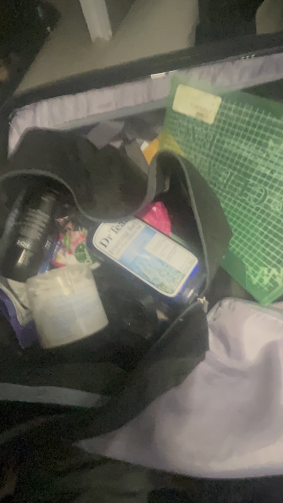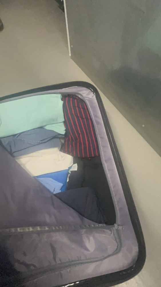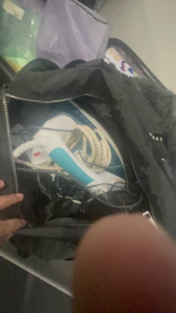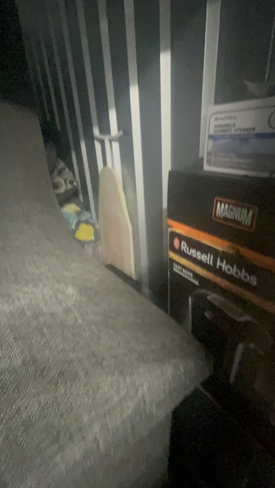 Unit has household items, corner side. Large LG TV. Suitcases either closed. Boxes inside unit. Coffee table.
