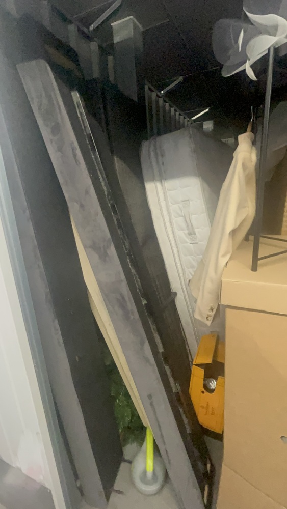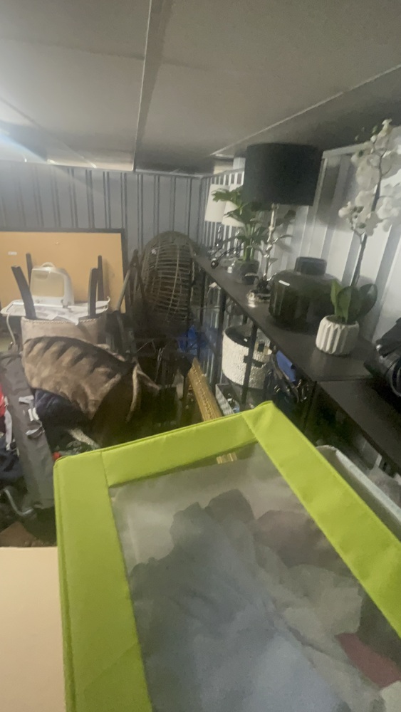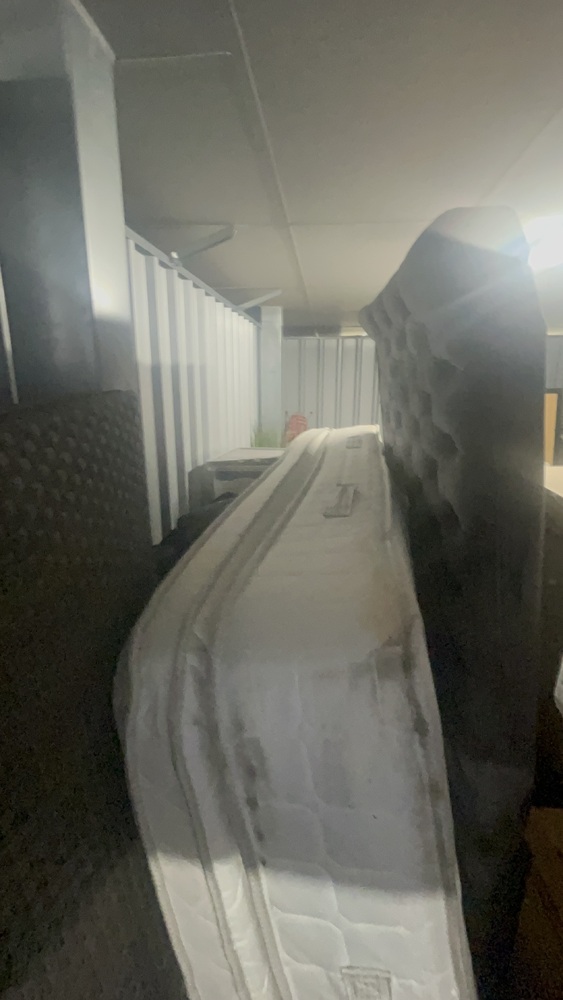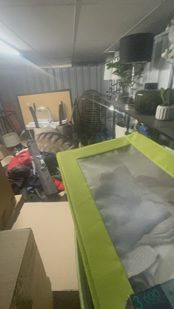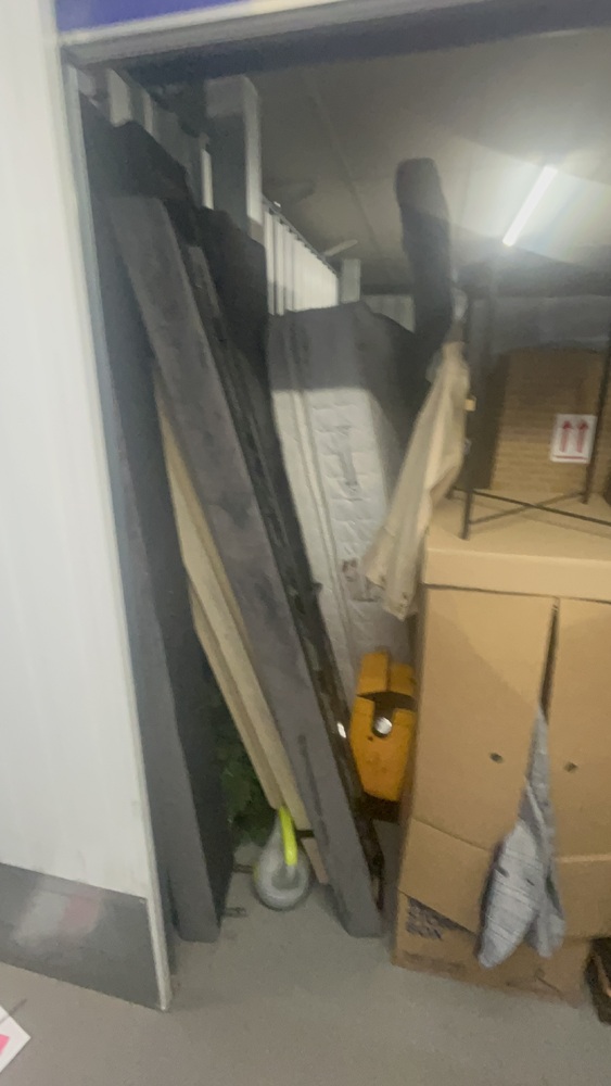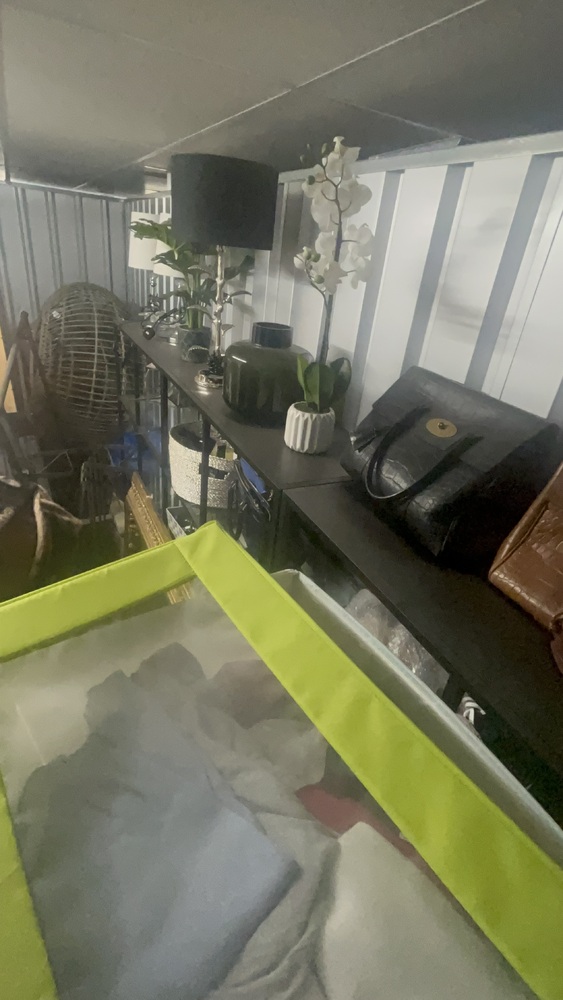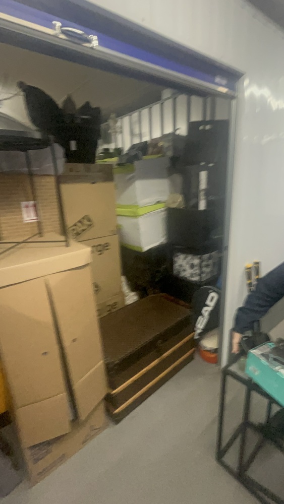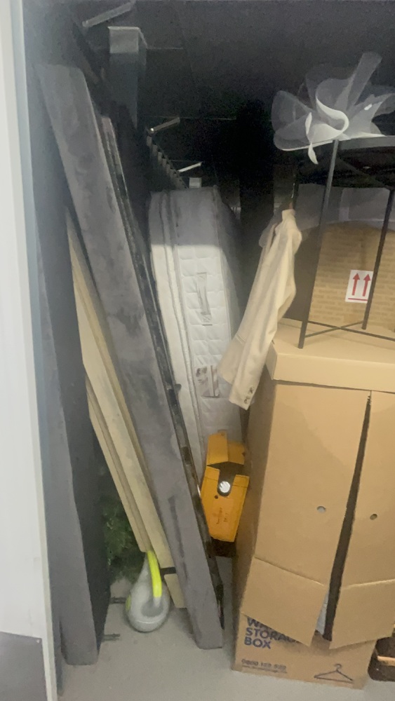 Unit has alot of household items which all look in good condition. Bed frame and mattress, exercise equipment and furniture, coffee table.tennis rackets brand new.large swing chair with stand. Other household items.