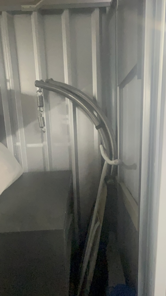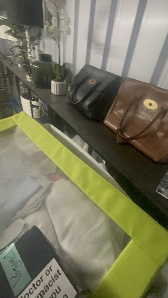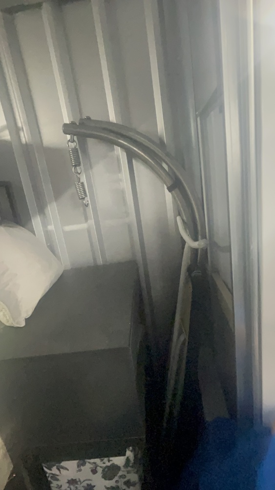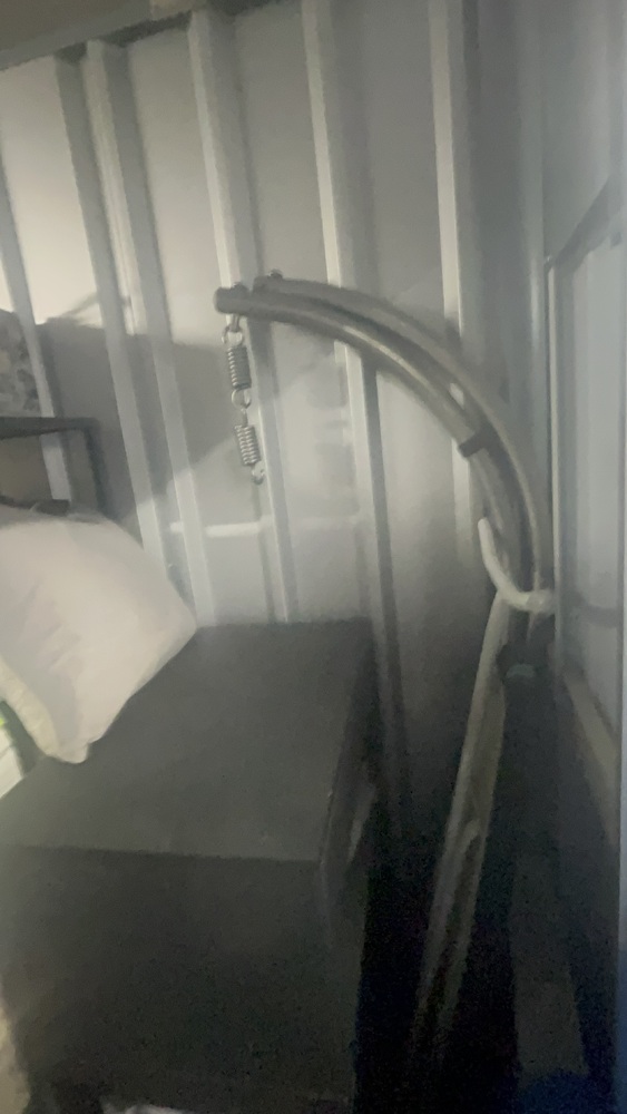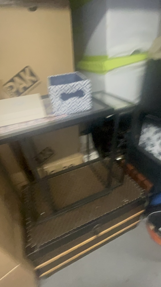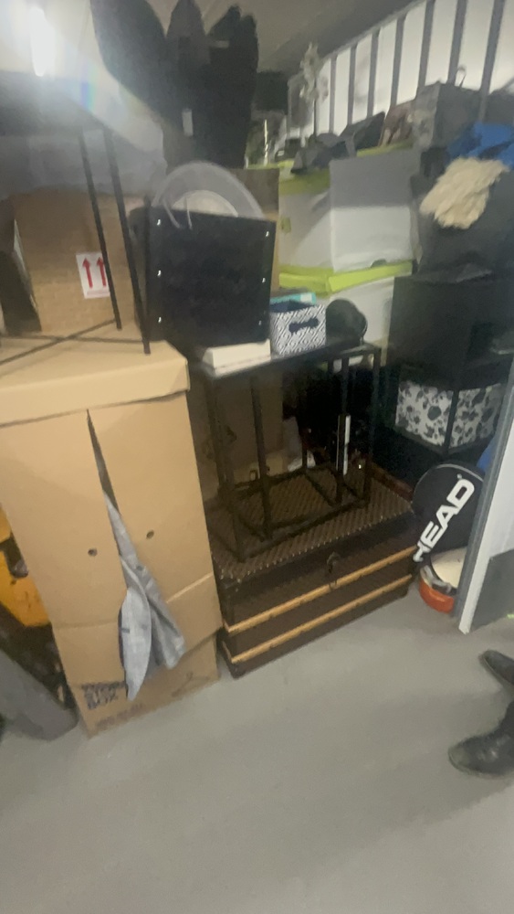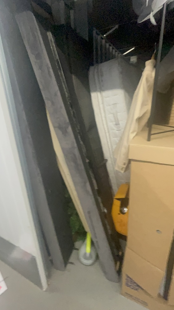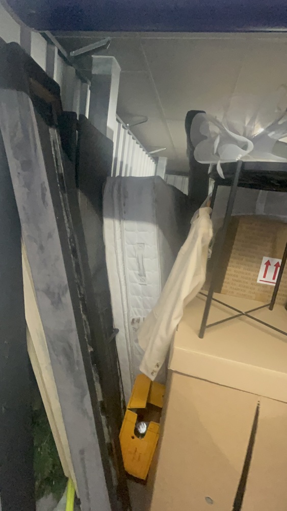 Unit has alot of household items which all look in good condition. Bed frame and mattress, exercise equipment and furniture, coffee table.tennis rackets brand new.large swing chair with stand. Other household items.