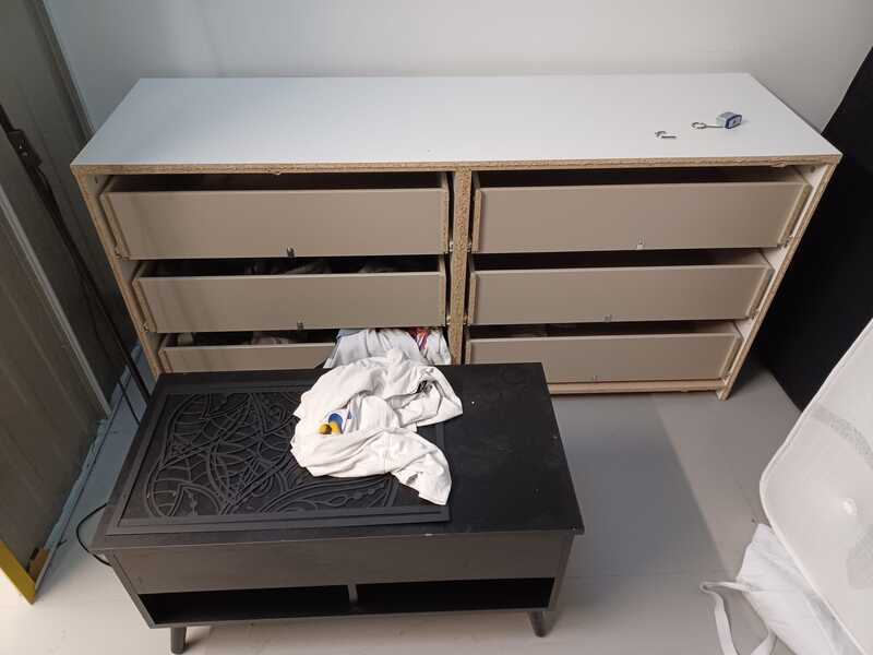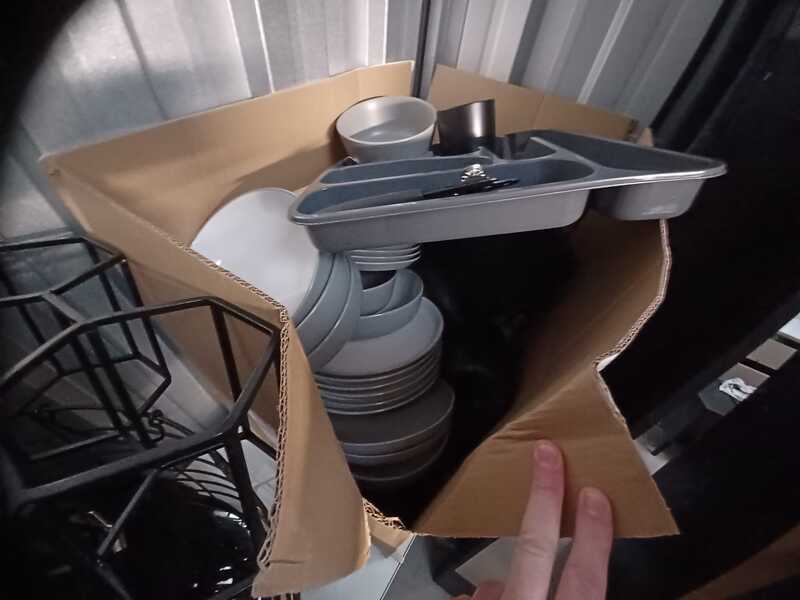CHEST OF DRAWERS, MIRROR, EKLECTRIC MAIDEN, GLASS DRESSING TABLE, BLACK RAG, GREY THROW, SOFA BED, BED FRAME, CROCKERY, PANS, ENTERTAINMENT STAND, BED SIDE TABLE, COFFEE TABLE, TARRINTINO ART, BEDDING, STANDING LAMP, LAMP SHADE, FOOT STOOL