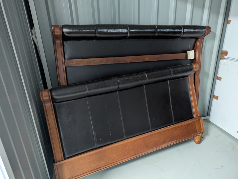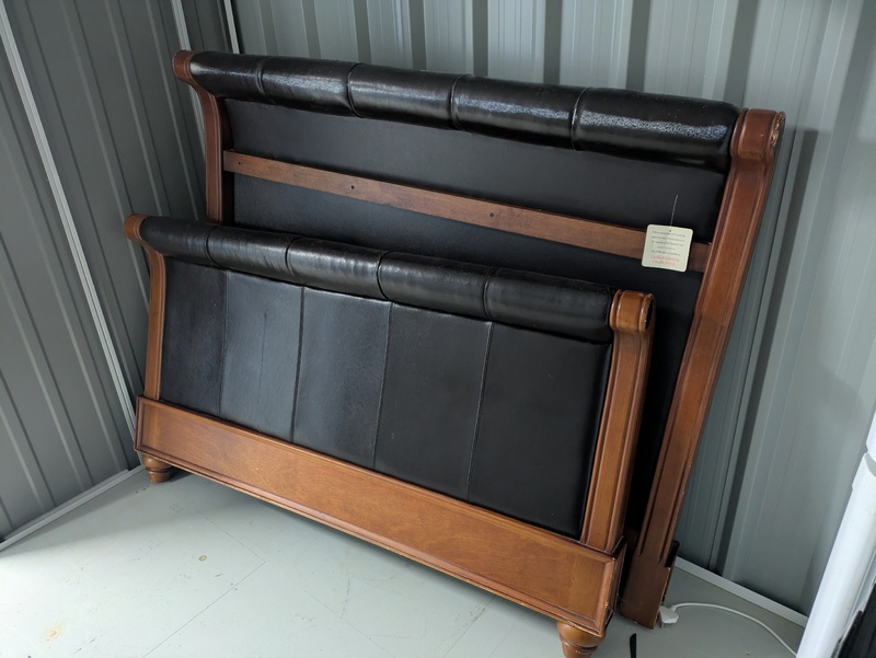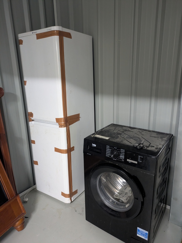 Hotpoint fridge and freezer. Beko washing machine. Leather and wood double/king size bed with slats.