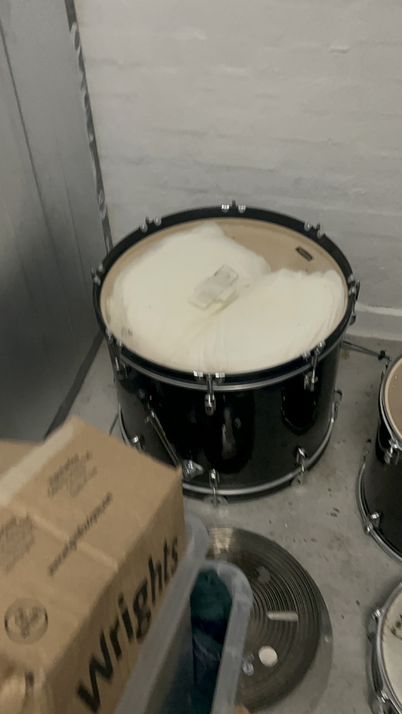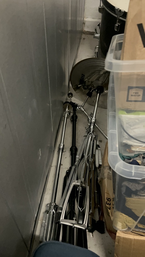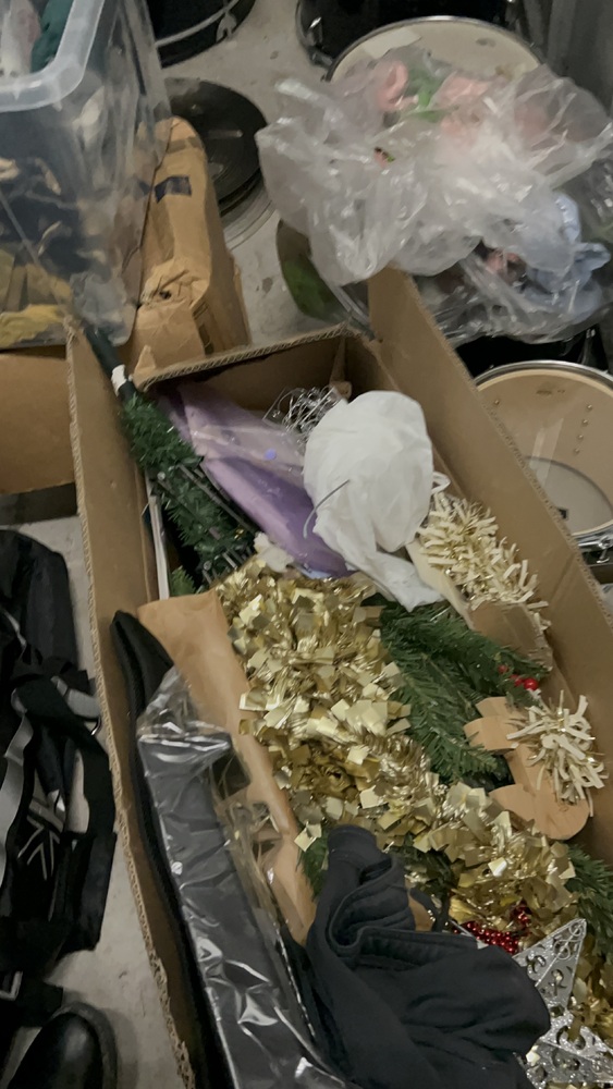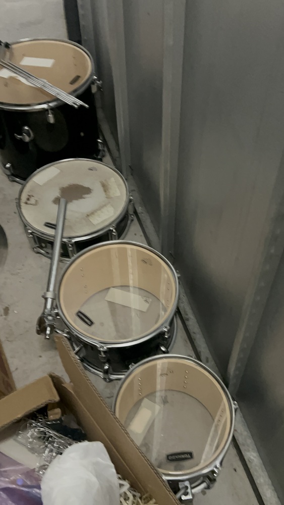 Drum kit including cymbals stands etc. Bags with clothing , Xmas decorations