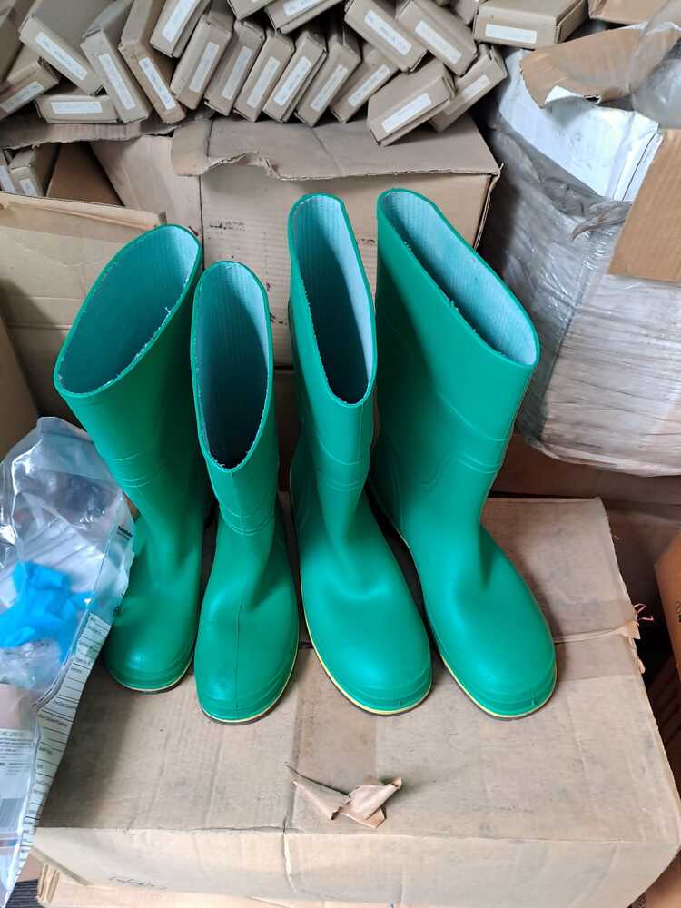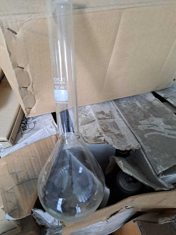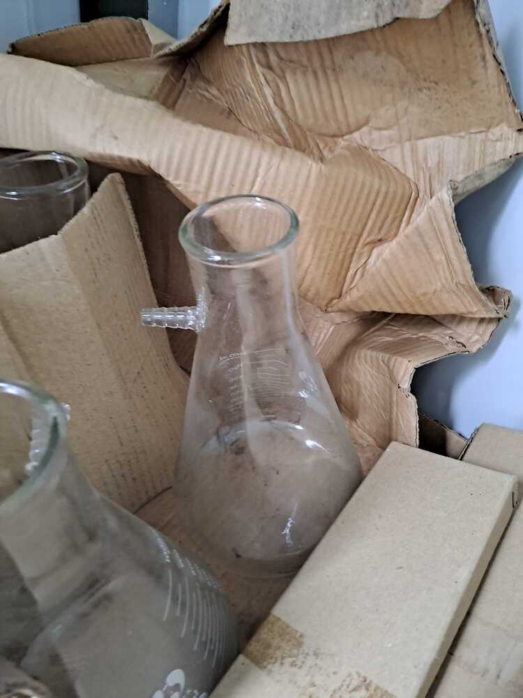 Boxes and boxes of chemistry glassware. Some furniture, sofa and a bed. There's a metal archway and some rubber boots too.