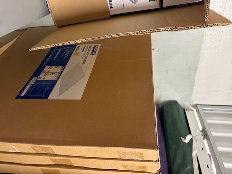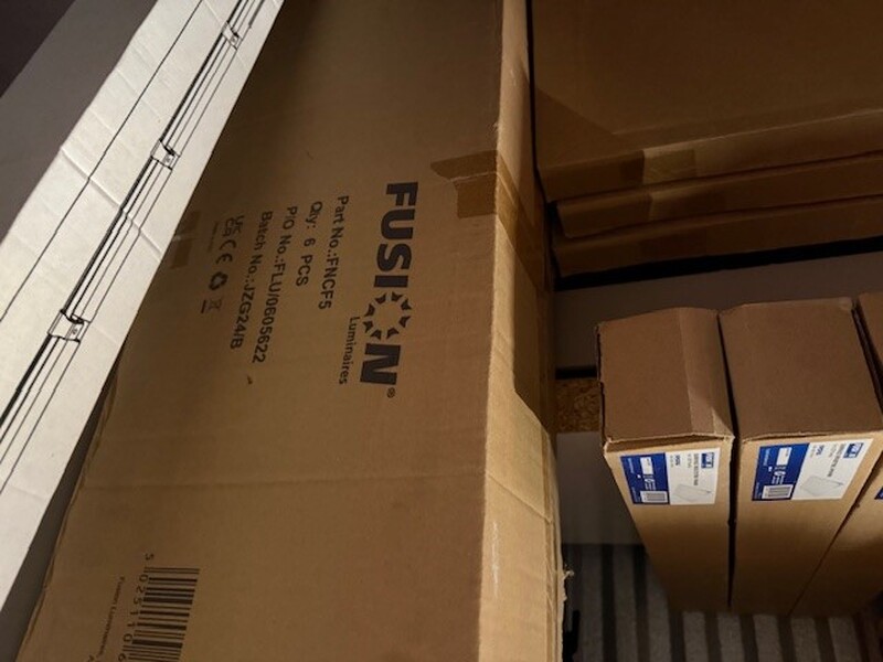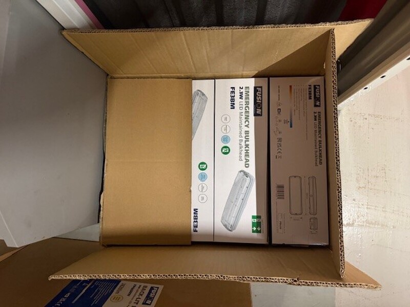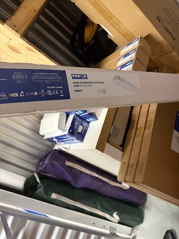The unit is 25sqft and contains a large amount of electrical and lighting materials. There are a few pieces of furniture as well.