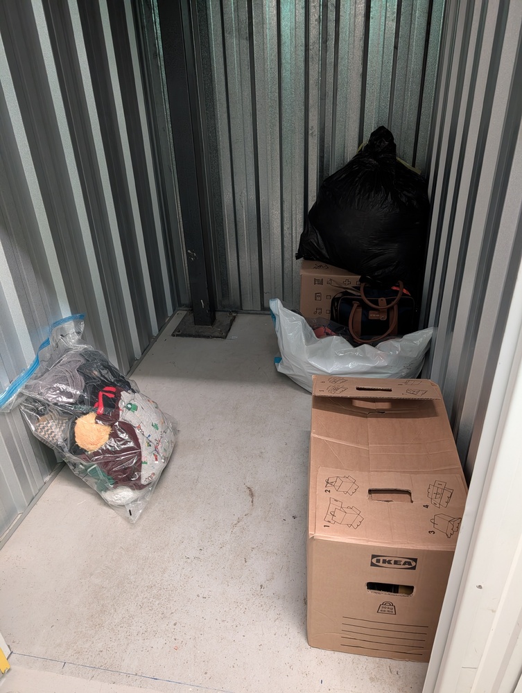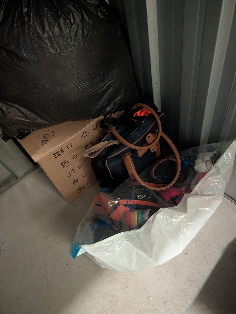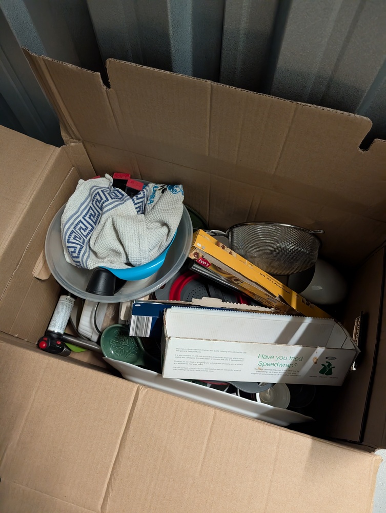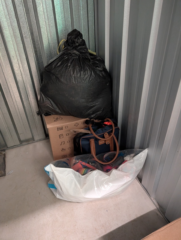 Unit contains some personal items of clothing, two boxes of misc., bags of misc. items, and some kitchen utensils