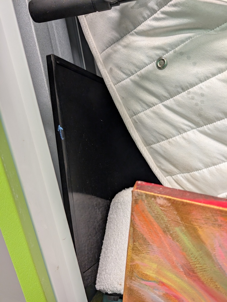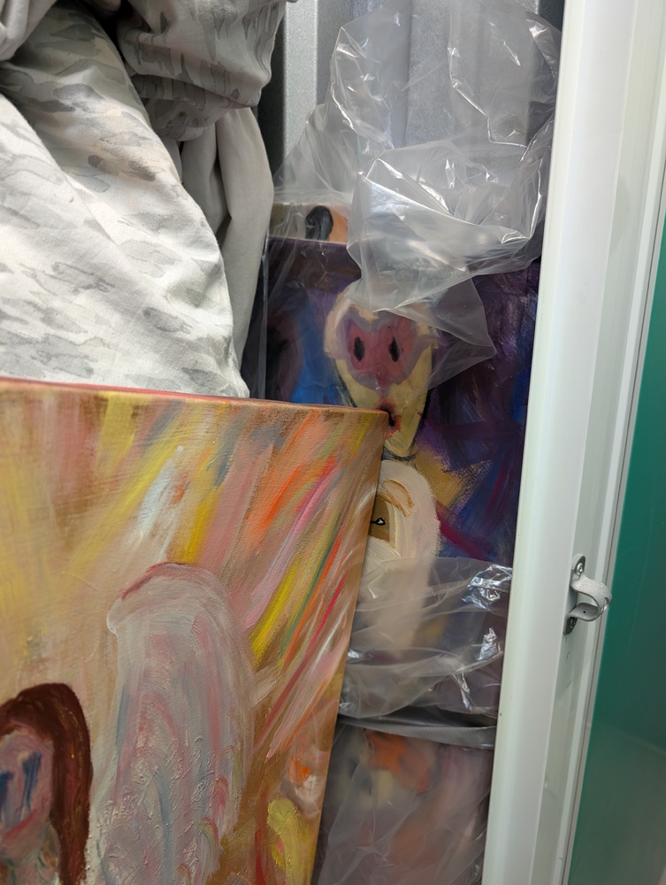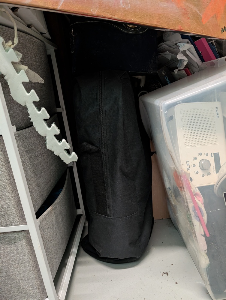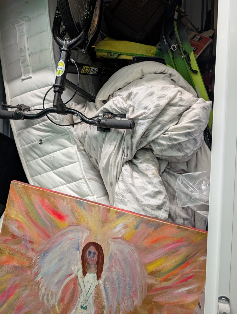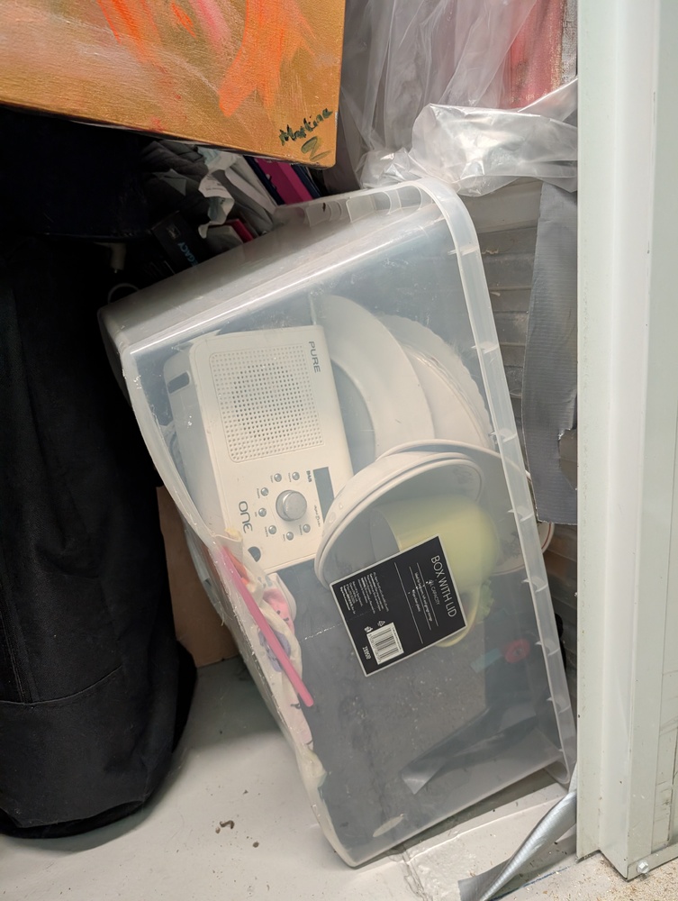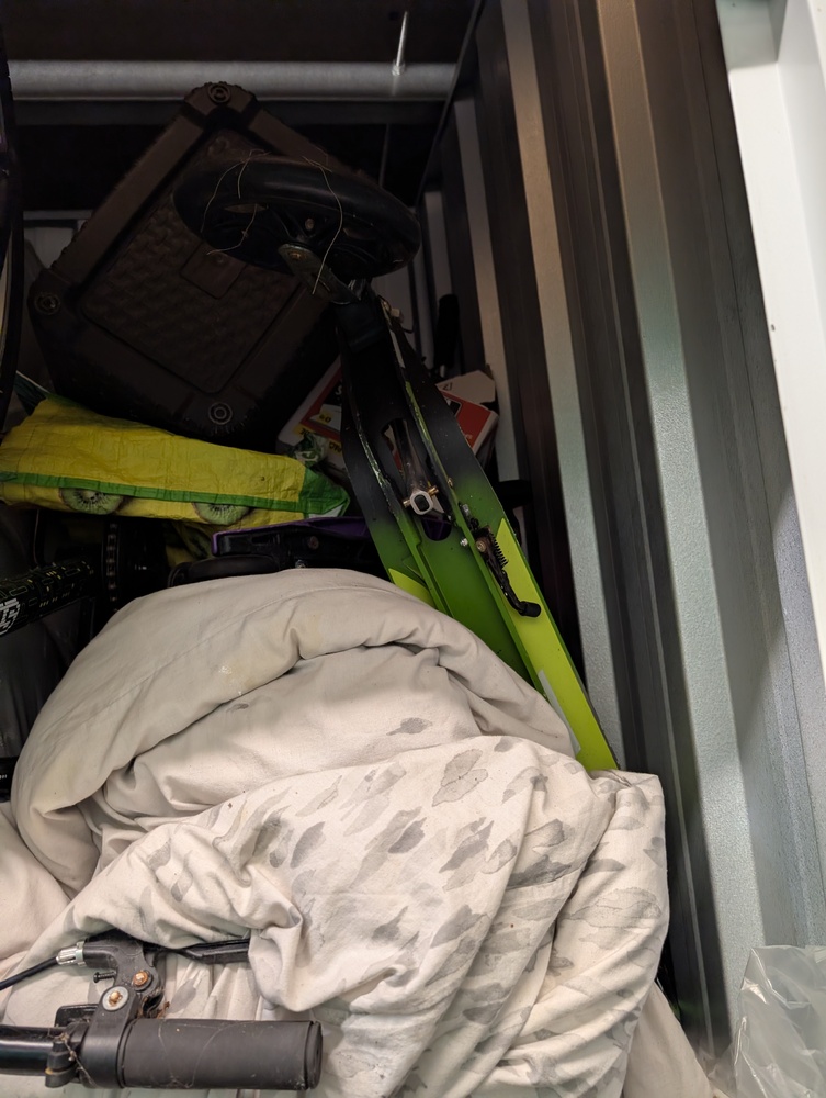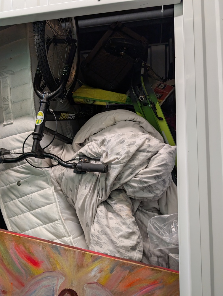 this unit has some boxes, bedding, dbl mattress, paintings, bicycle, scooter, other home related items