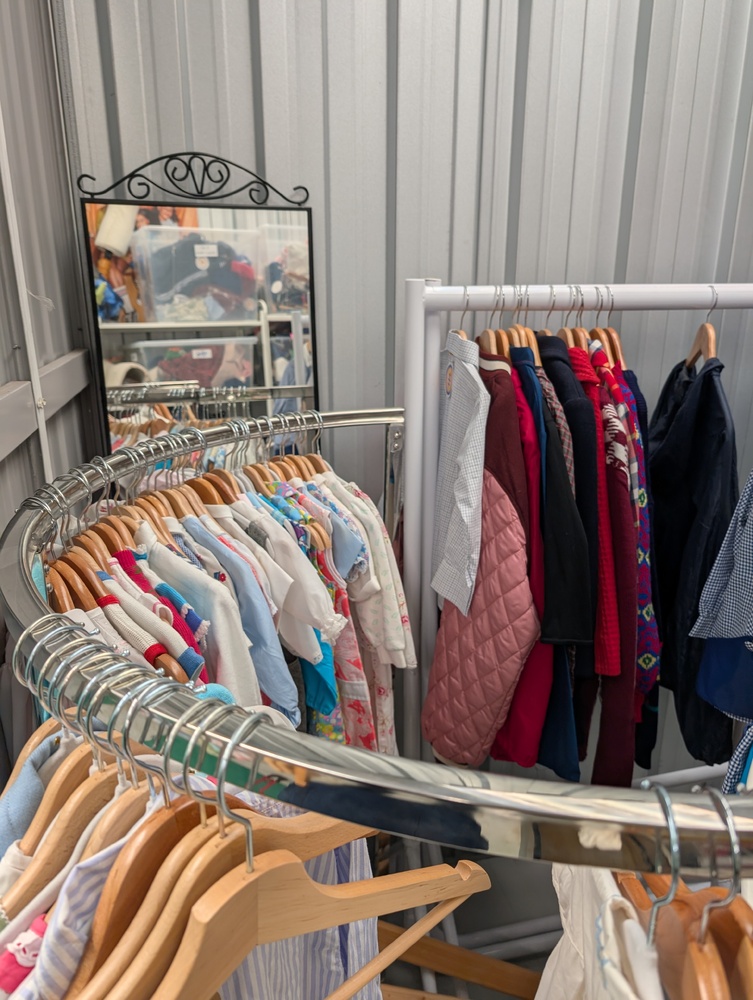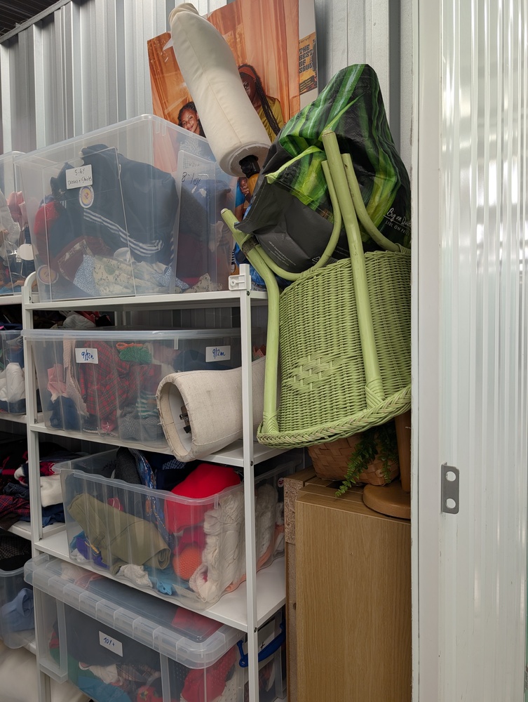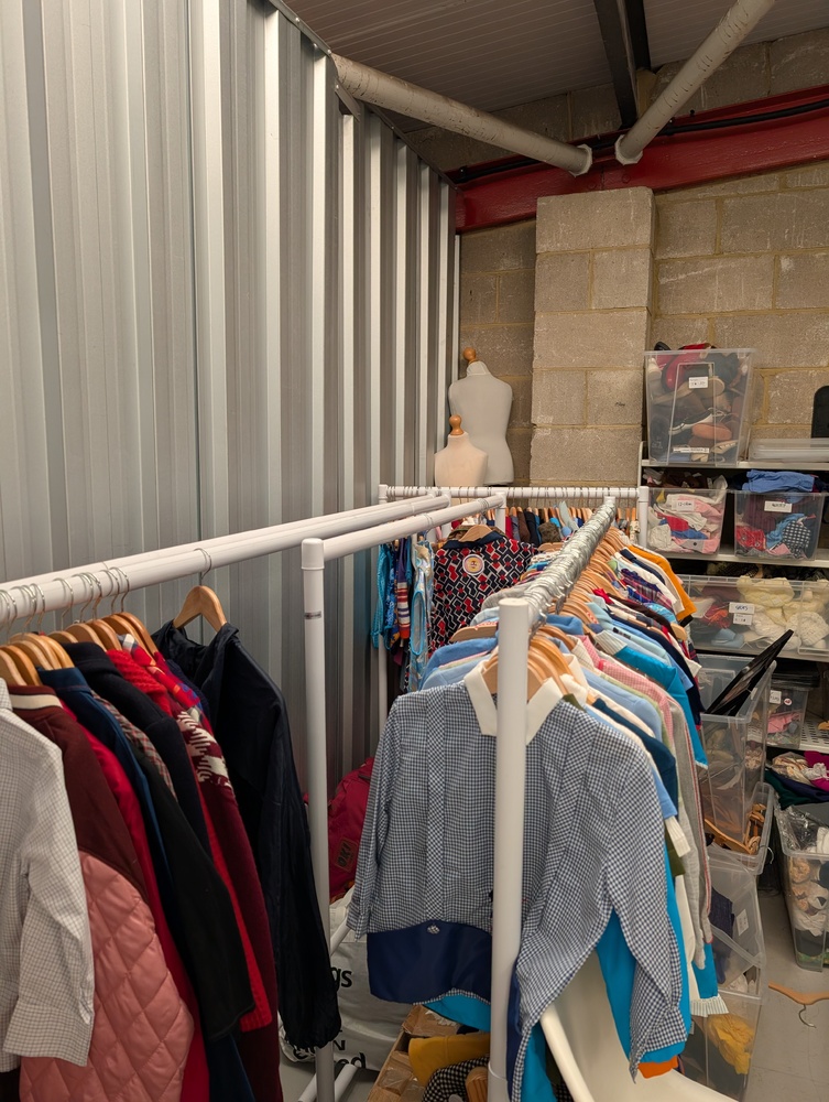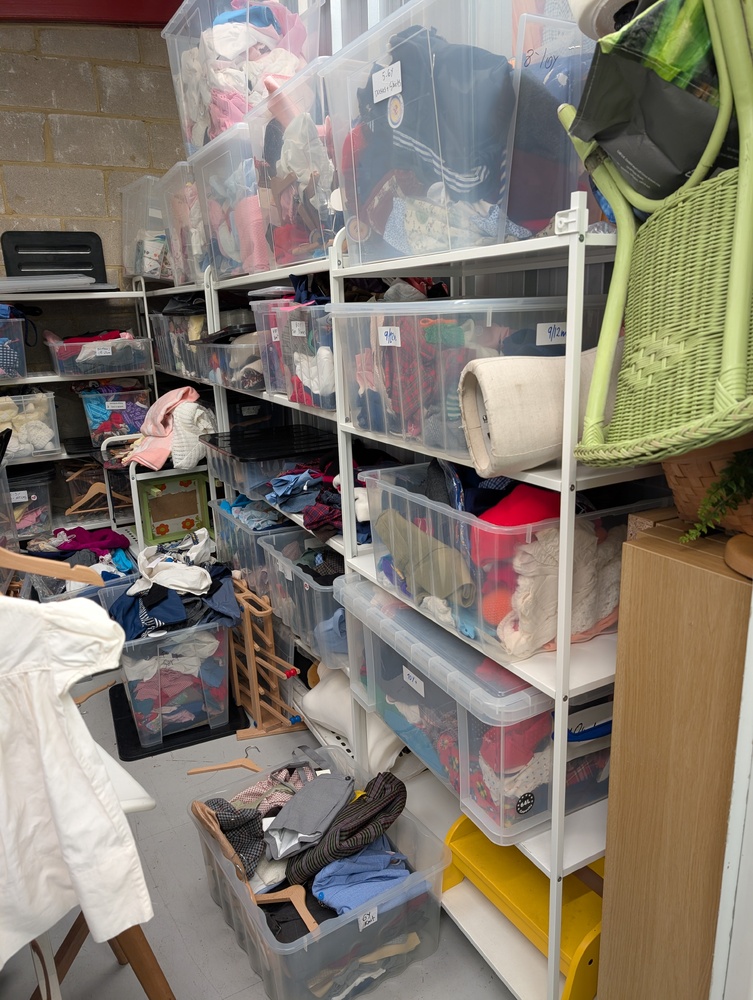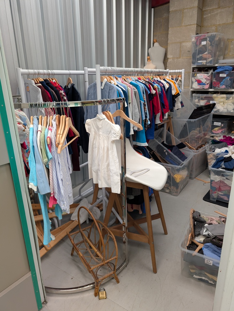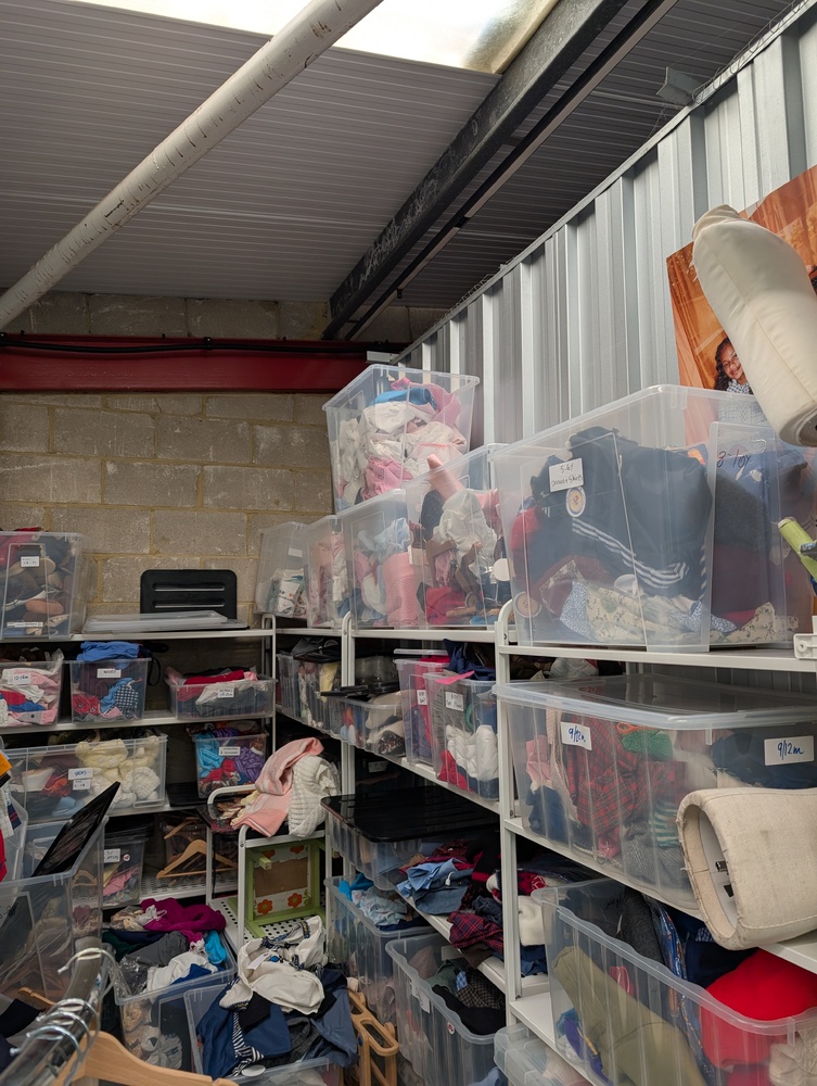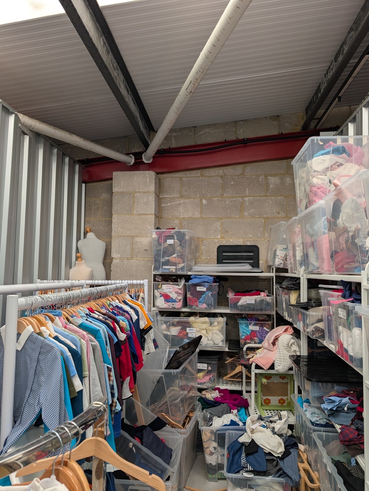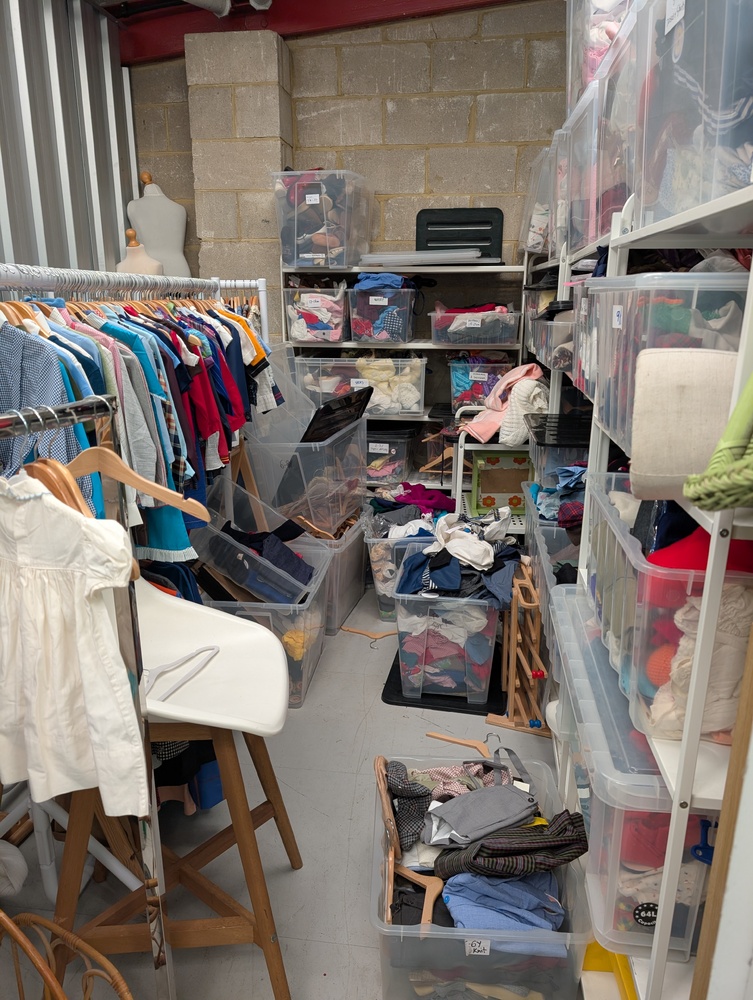 Unit contains a large amount of toddlers clothing, some on hanging rails, some packaged. Large amount in plastic crates, some shelving and a few items of furniture.