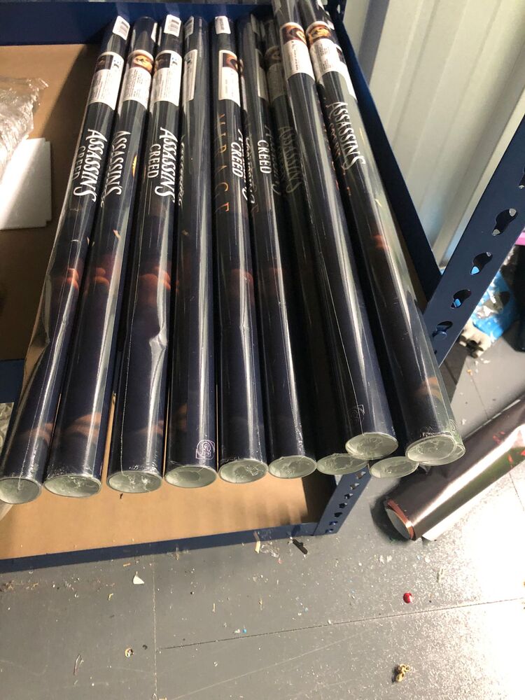 a selection of 91 poster rolls wrapped in plastic, condition ranges from excellent to poor features assassins creed, My Hero Academia, Call of Duty, Attack on Titan, Miku and Takoyaki