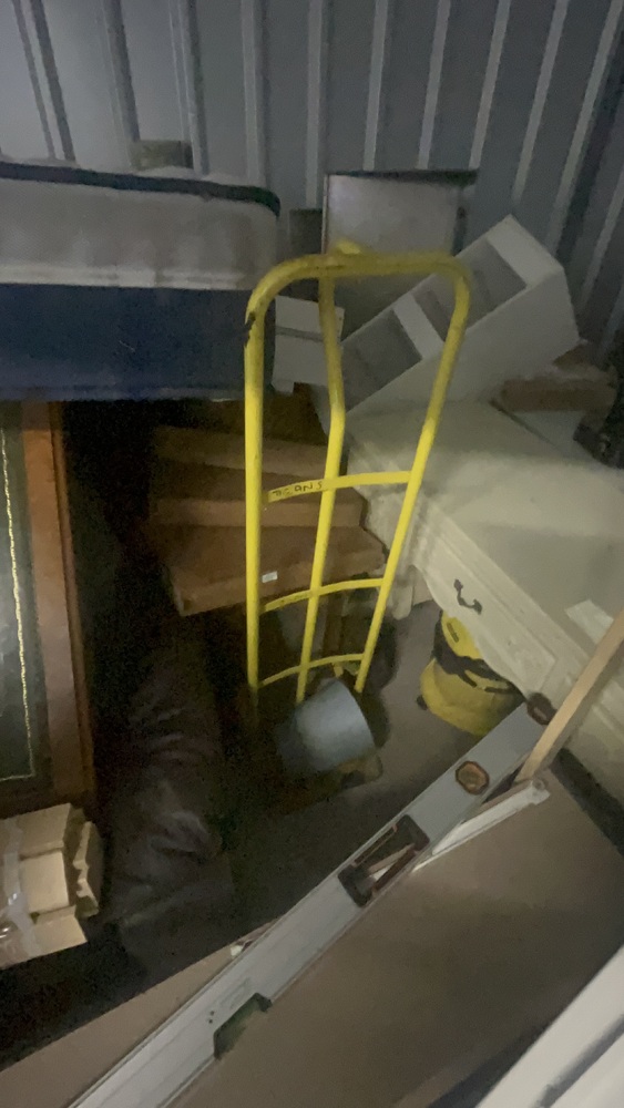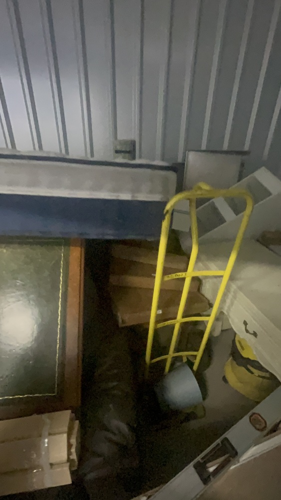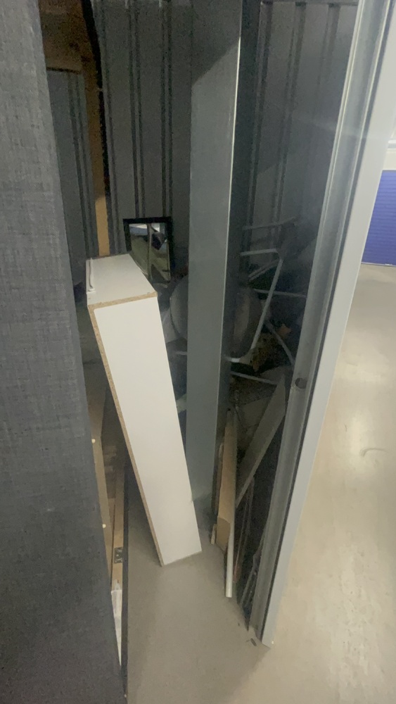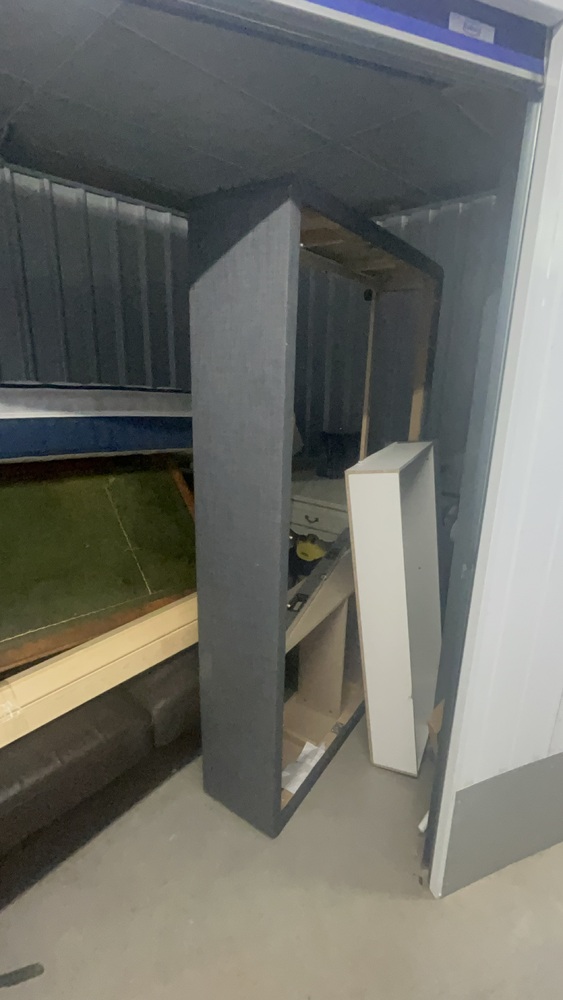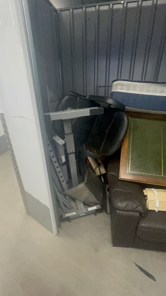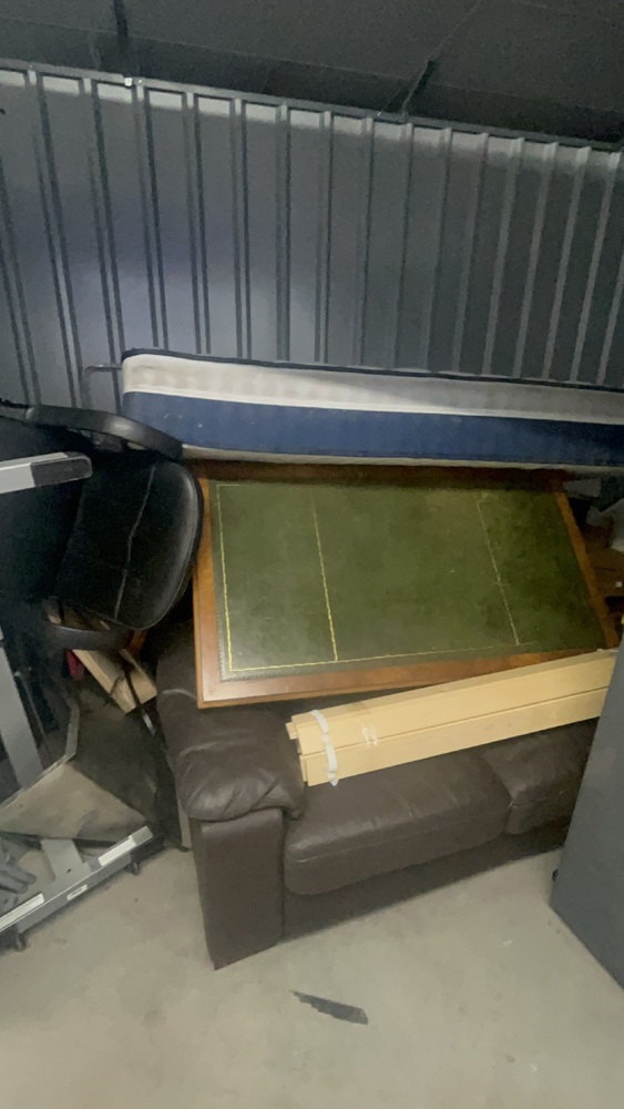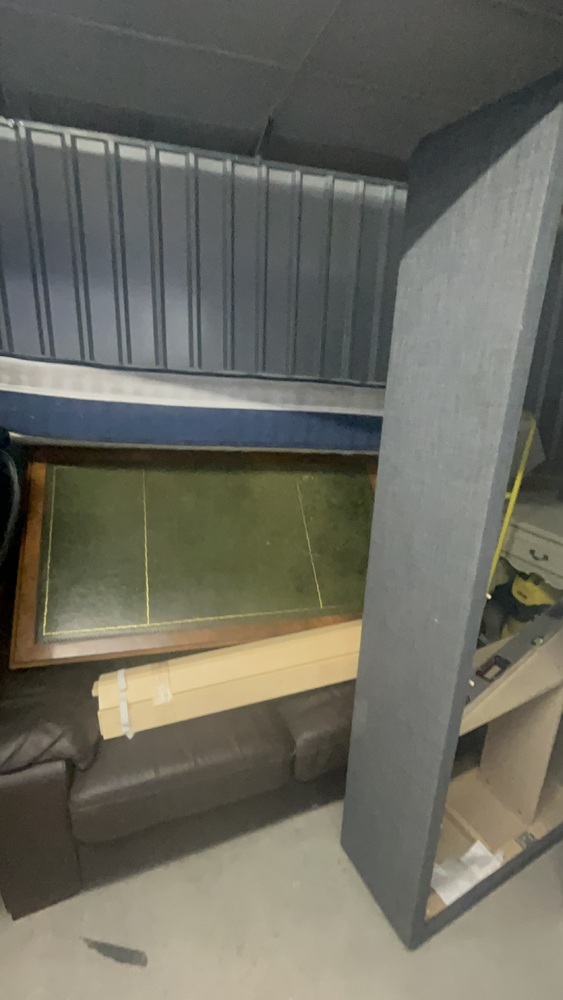 Unit has cabinets, frame for bed, step ladder, karcher vacuum. Coffee table, office chair. Bedside table
