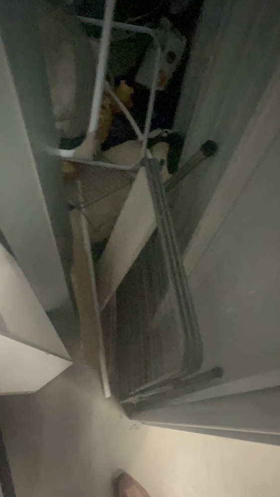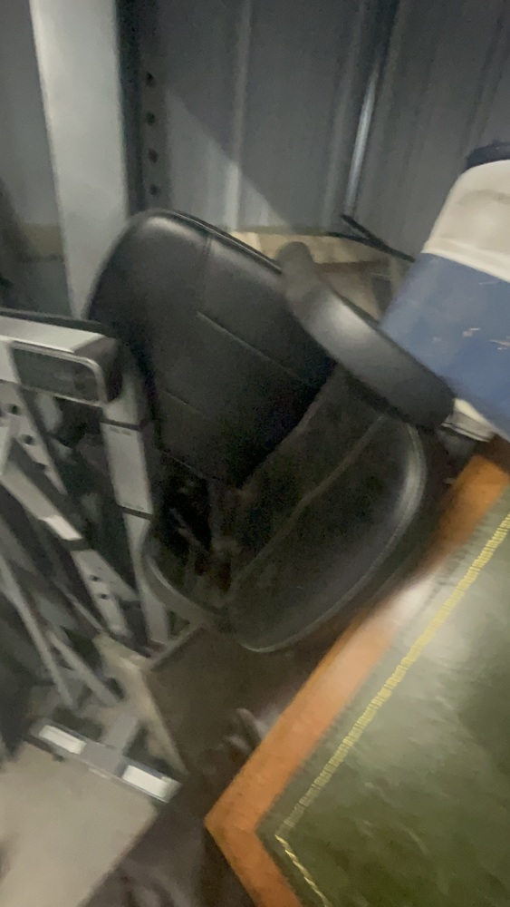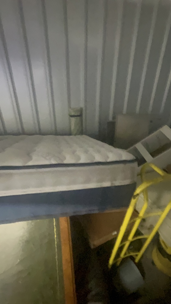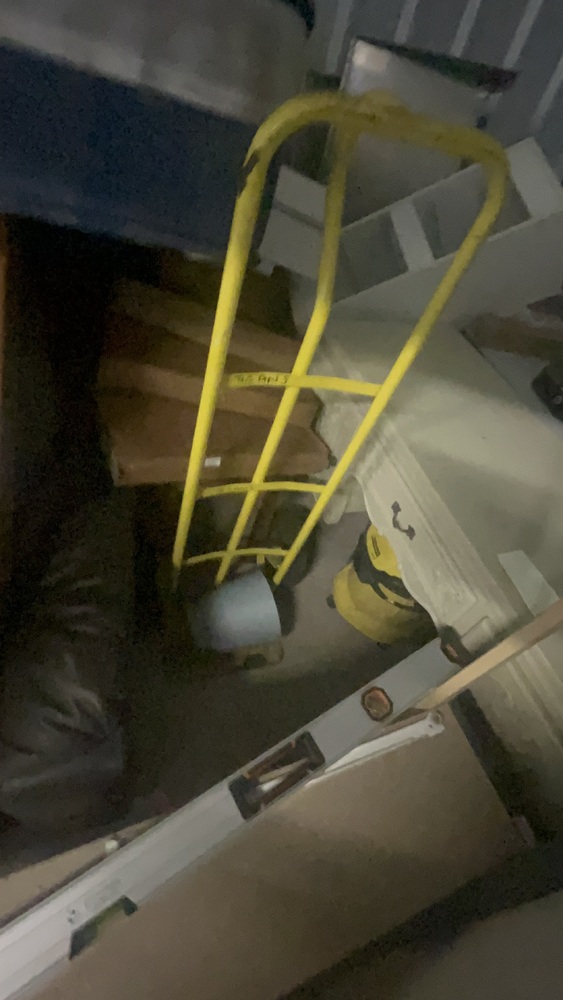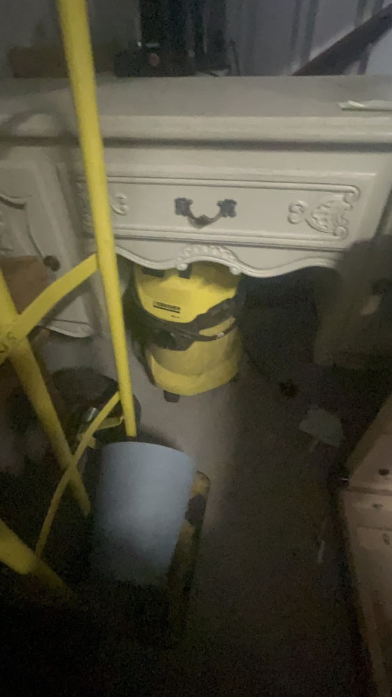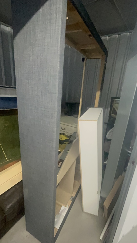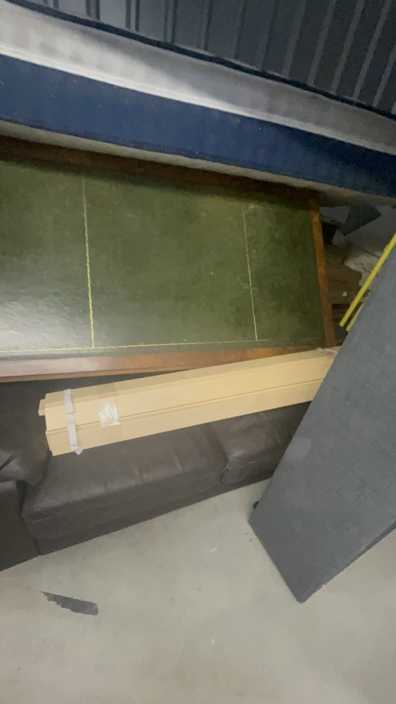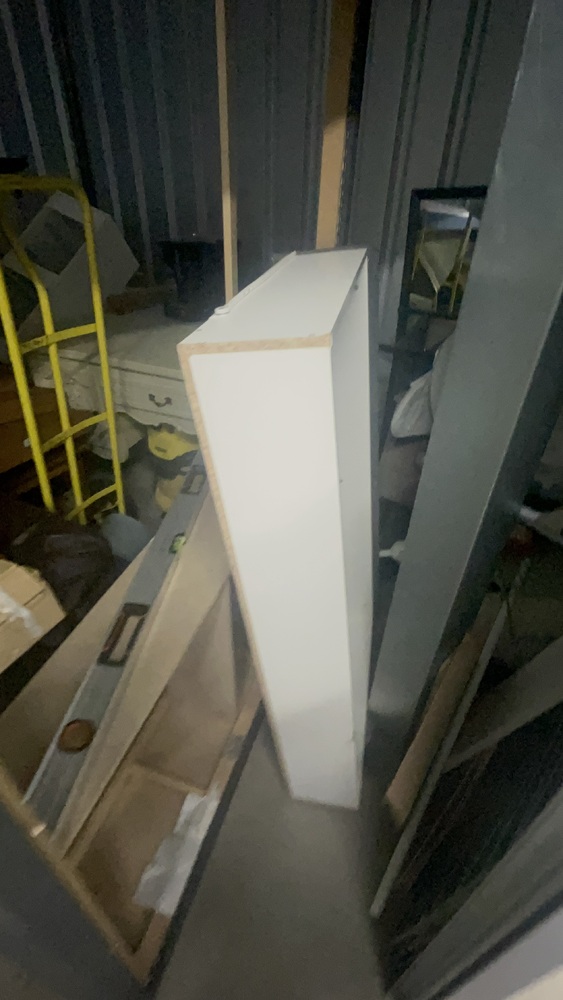 Unit has cabinets, frame for bed, step ladder, karcher vacuum. Coffee table, office chair. Bedside table