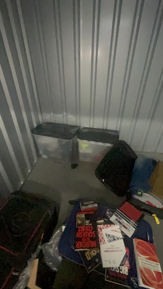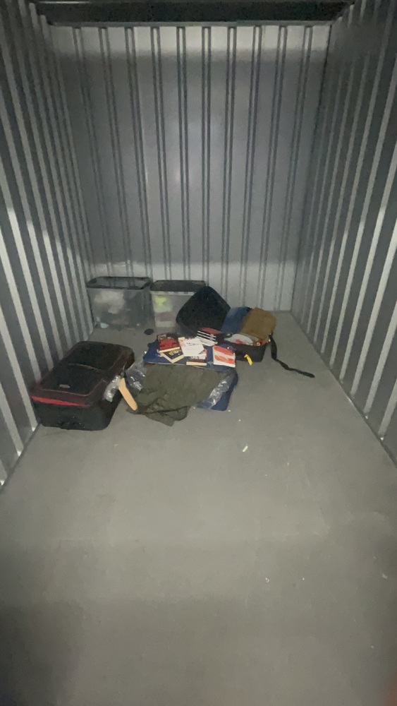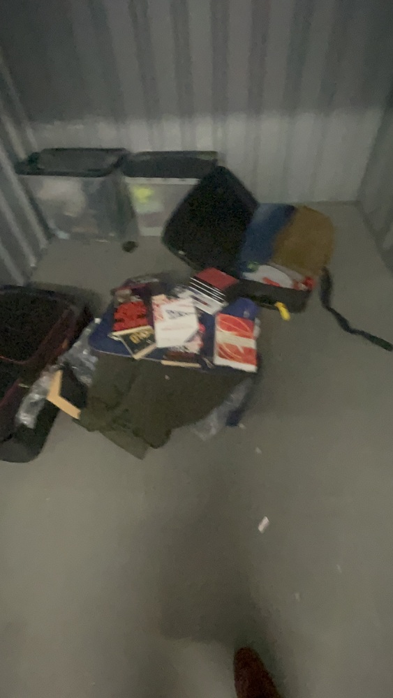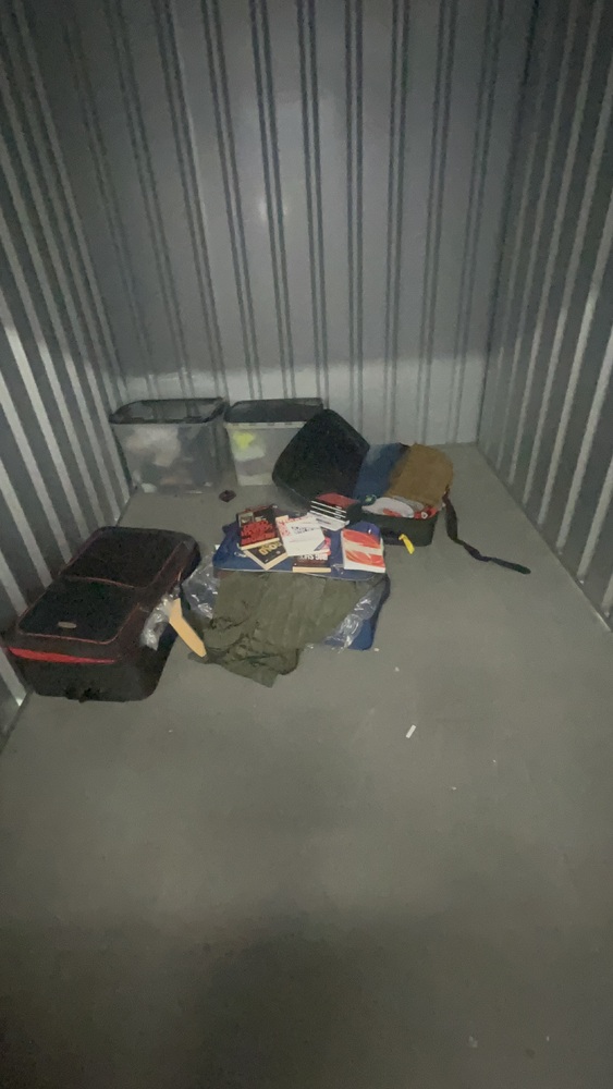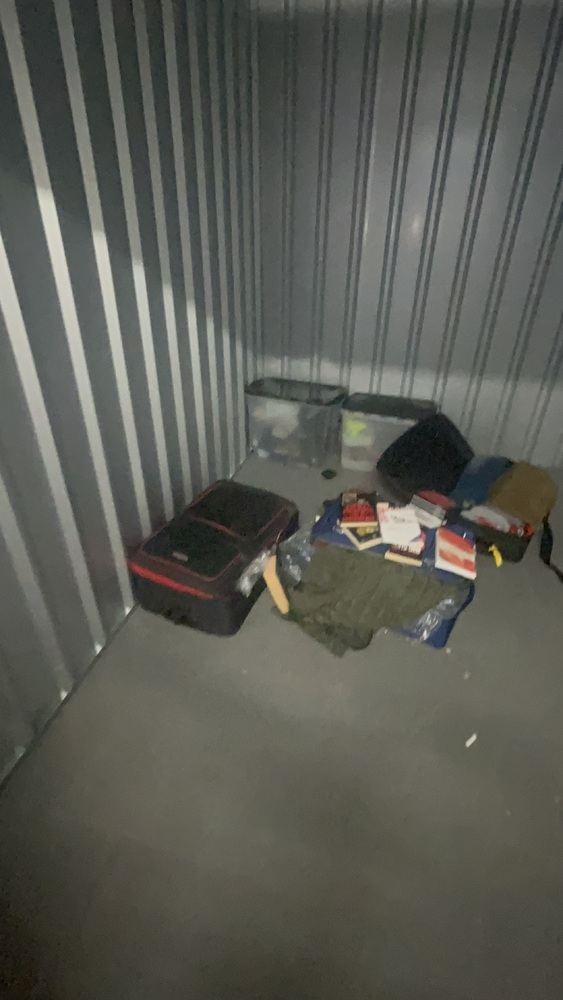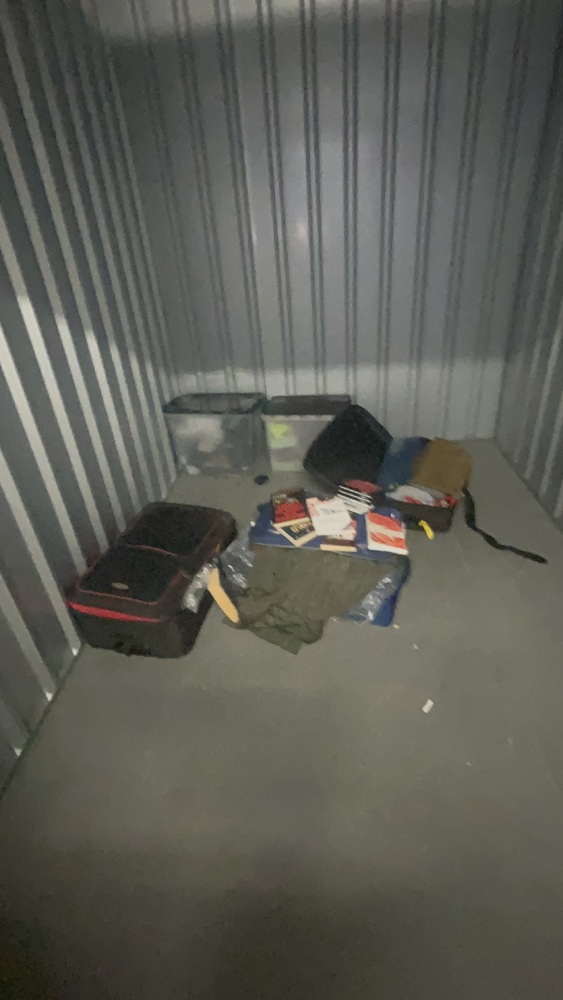 Unit has household items. Suitcases of clothes, mostly men and some designer clothing. Other boxes have books and empty boxes with.