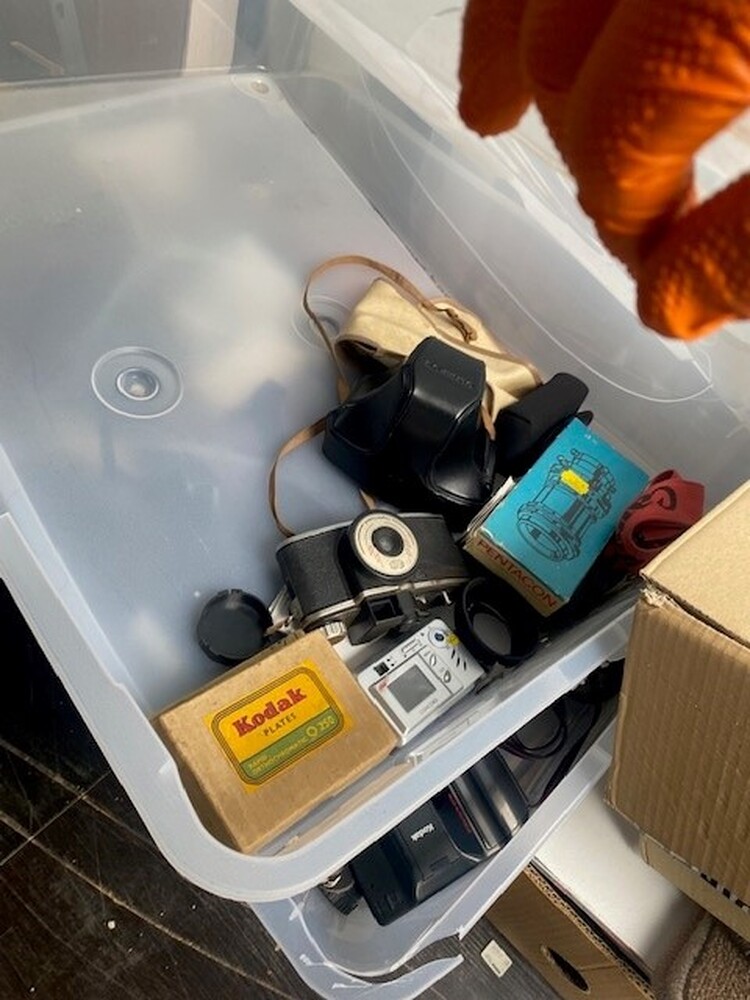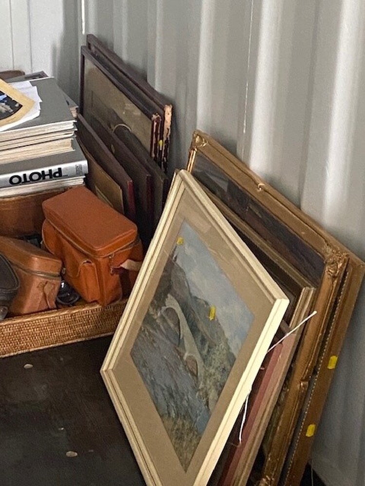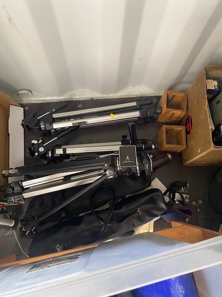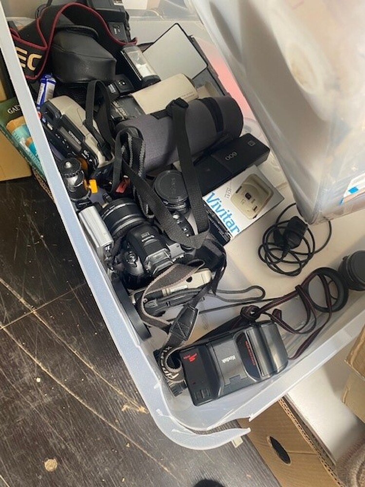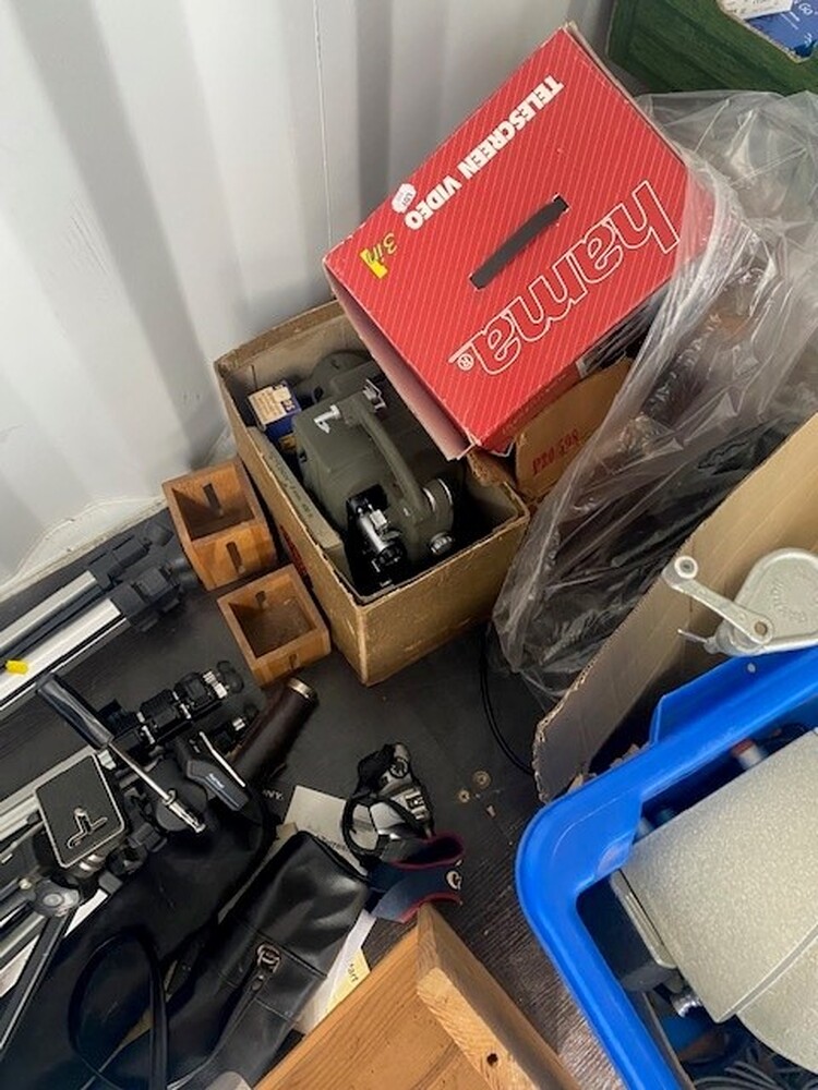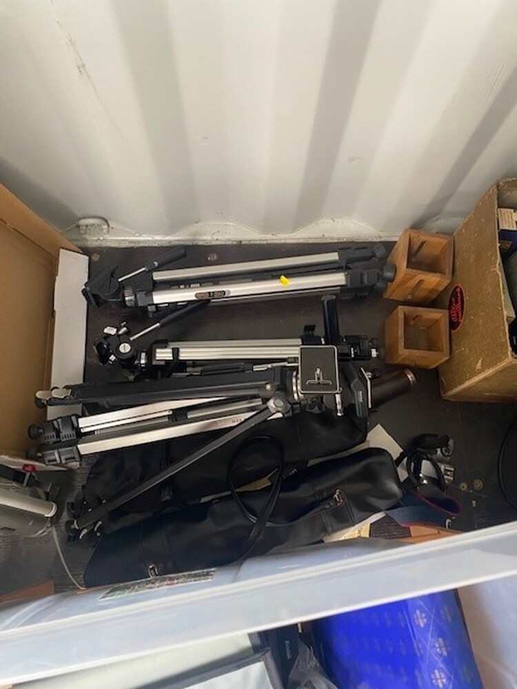 This is one for a photography enthusiast. The unit appears to contain, photography equipment including, cameras, camera boxes, camera stands, lighting, video equipment, DVDs, binoculars, photography books, framed prints.