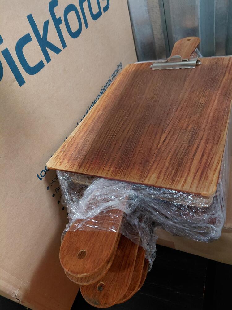 liquidation stock - several catering equipment items, stools, wooden serving boards, first aid kit, cooking pans, wooden table, tea