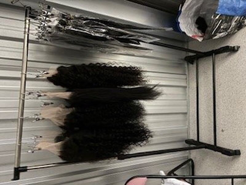 Hanging rail with hair extensions, black bin bag of hair extensions, folding chairs , desk and a television