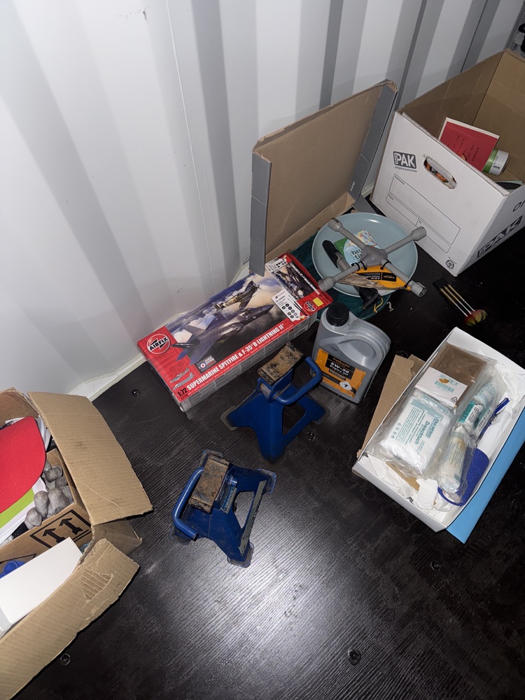 Auctioning the contents of a storage container offering a varied and interesting selection of items. This lot includes a collection of model planes, ideal for hobbyists, collectors, or display. A hydraulic car jack is also included, suitable for vehicle maintenance or garage use. There is a set of darts for leisure or pub-style games, along with a rug that could suit a living space or workshop area. The container also holds kites, great for outdoor fun and family activities.