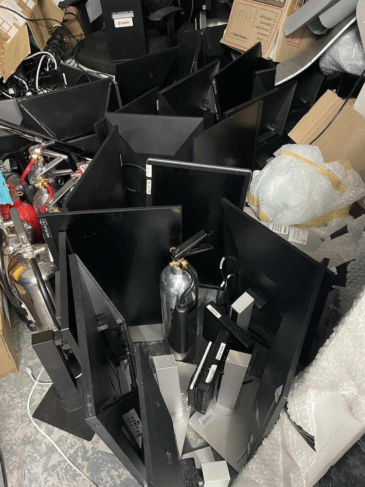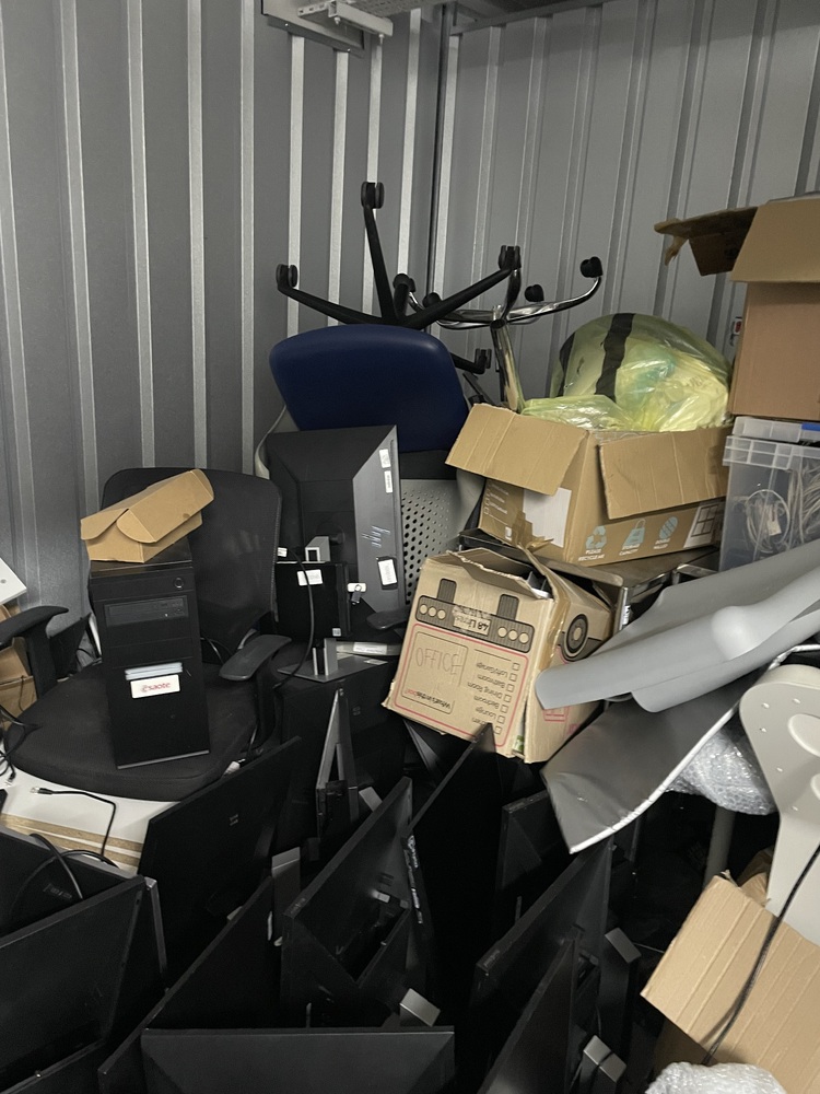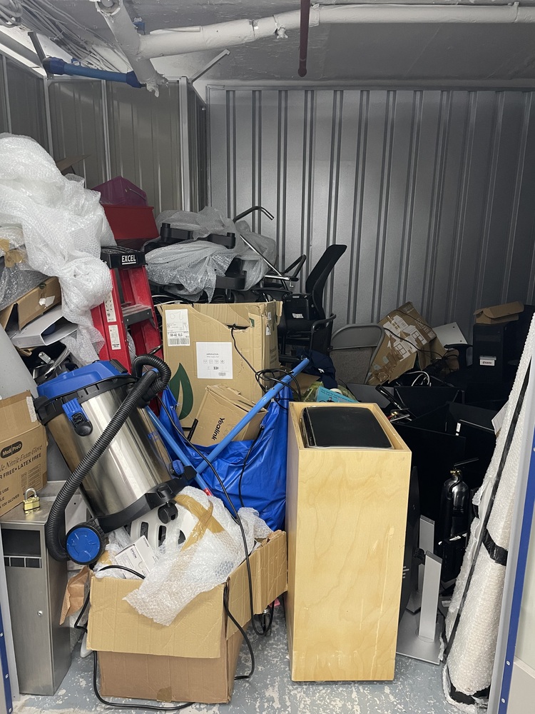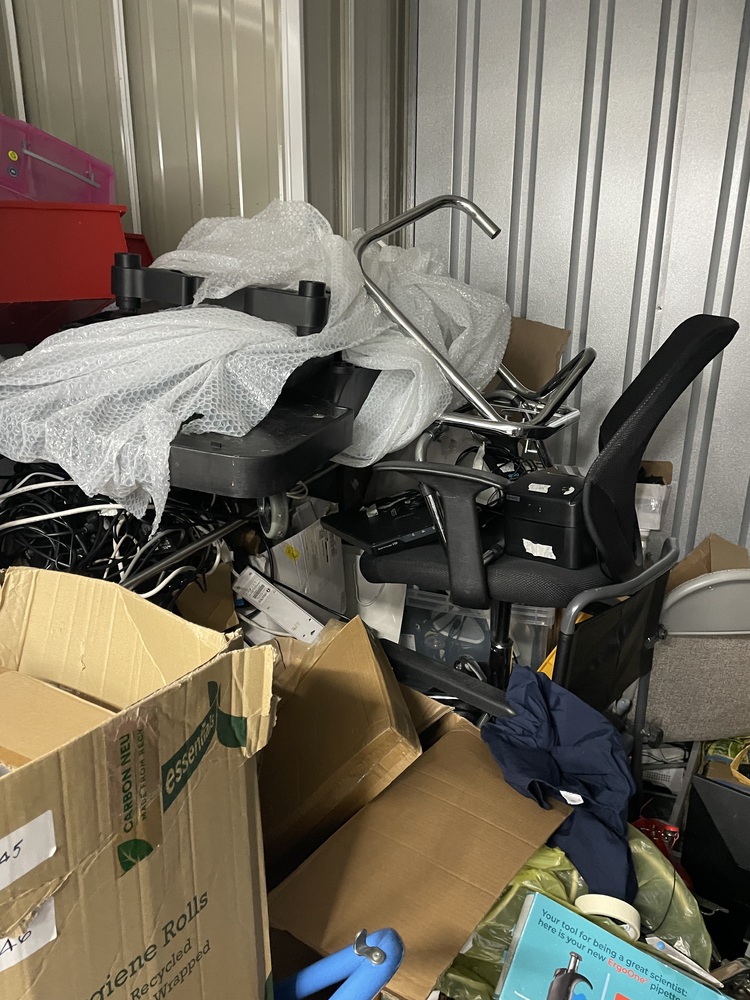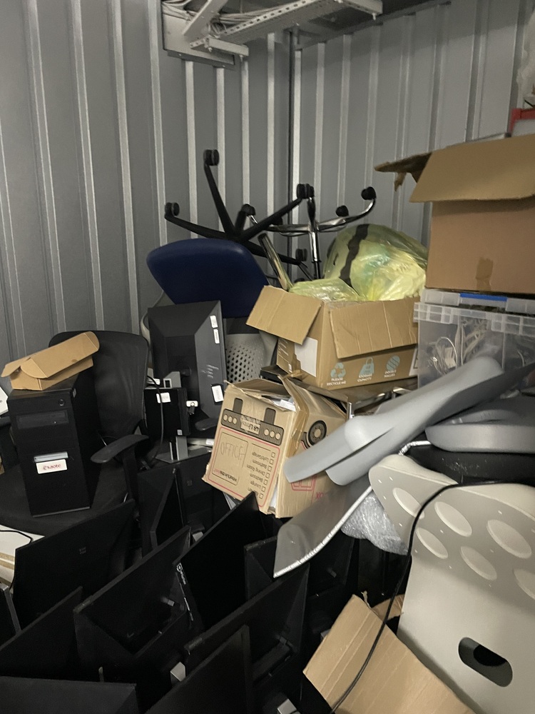 This is a 150ft very messy room consisting mainly of office furniture and supplies items seen: