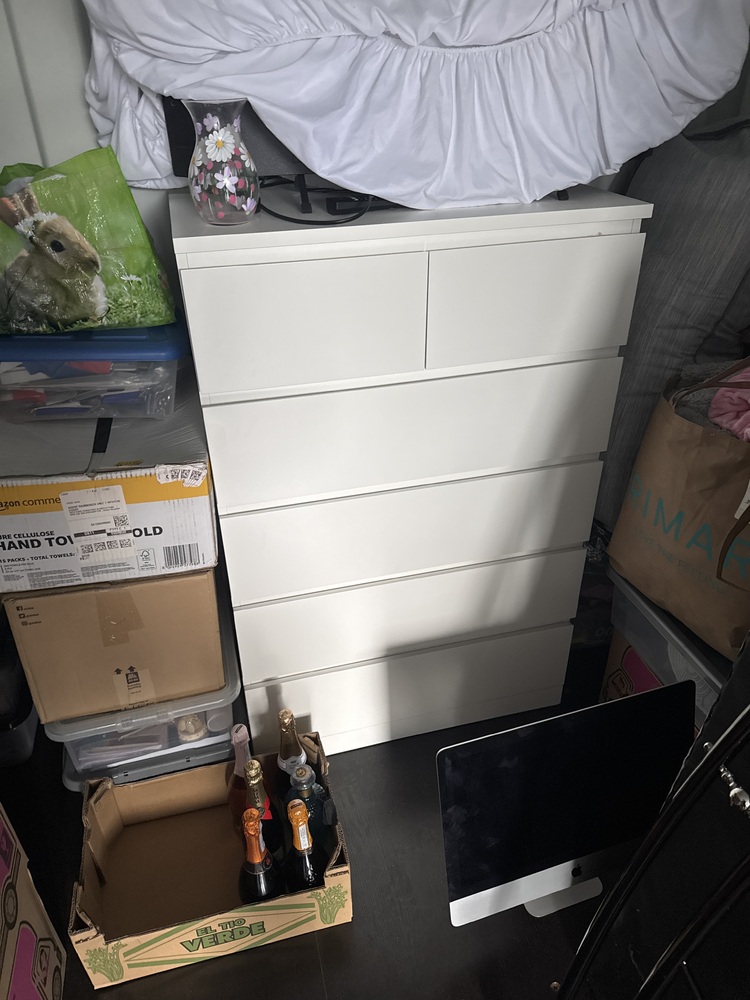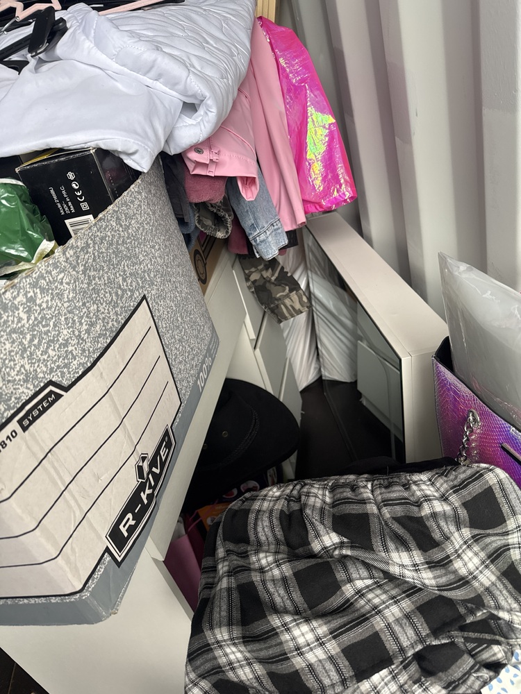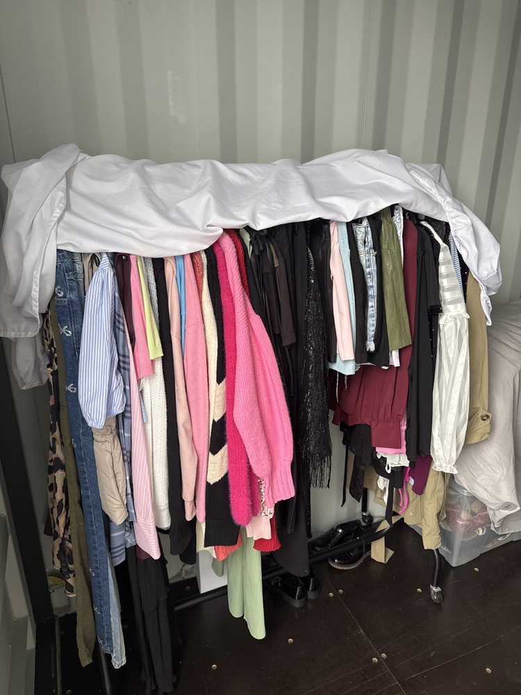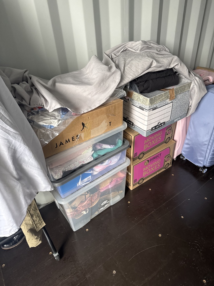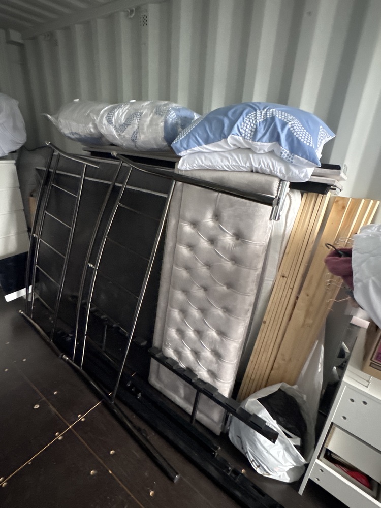 Auctioning the full contents of a storage container sold as one lot. Items include a double bed frame with matching mattress, a practical chest of drawers suitable for bedroom storage, and a selection of various clothes covering everyday wear. Also included are multiple boxes containing assorted household items, offering plenty of potential value for resellers or home use.