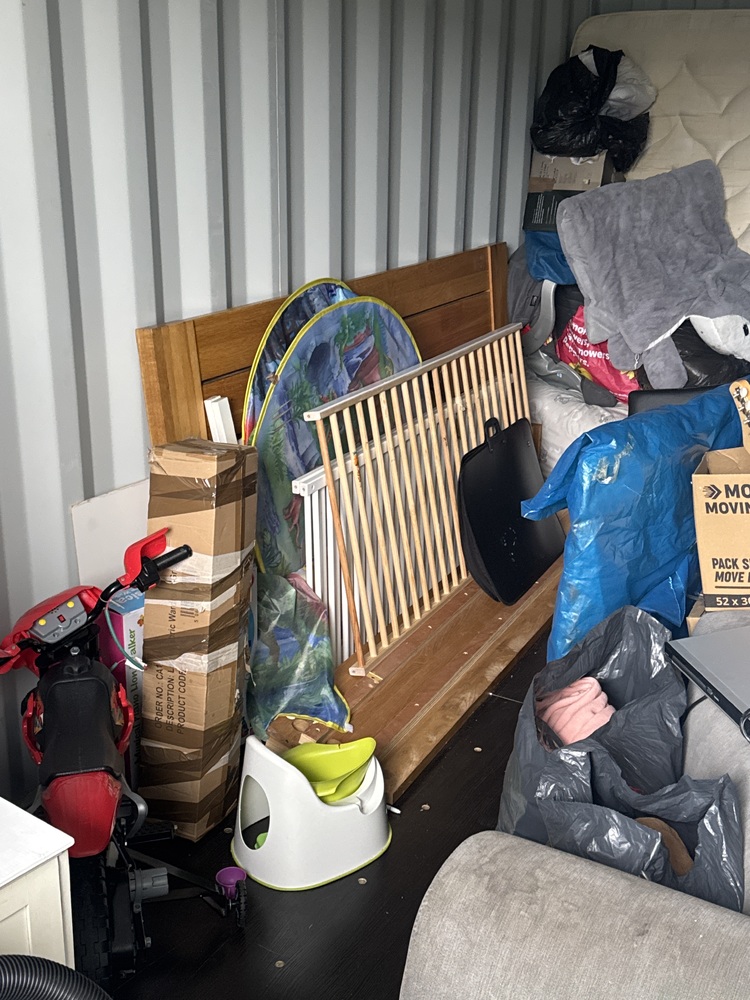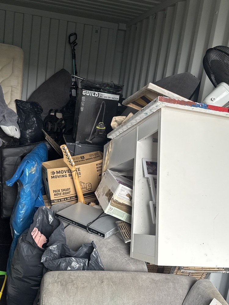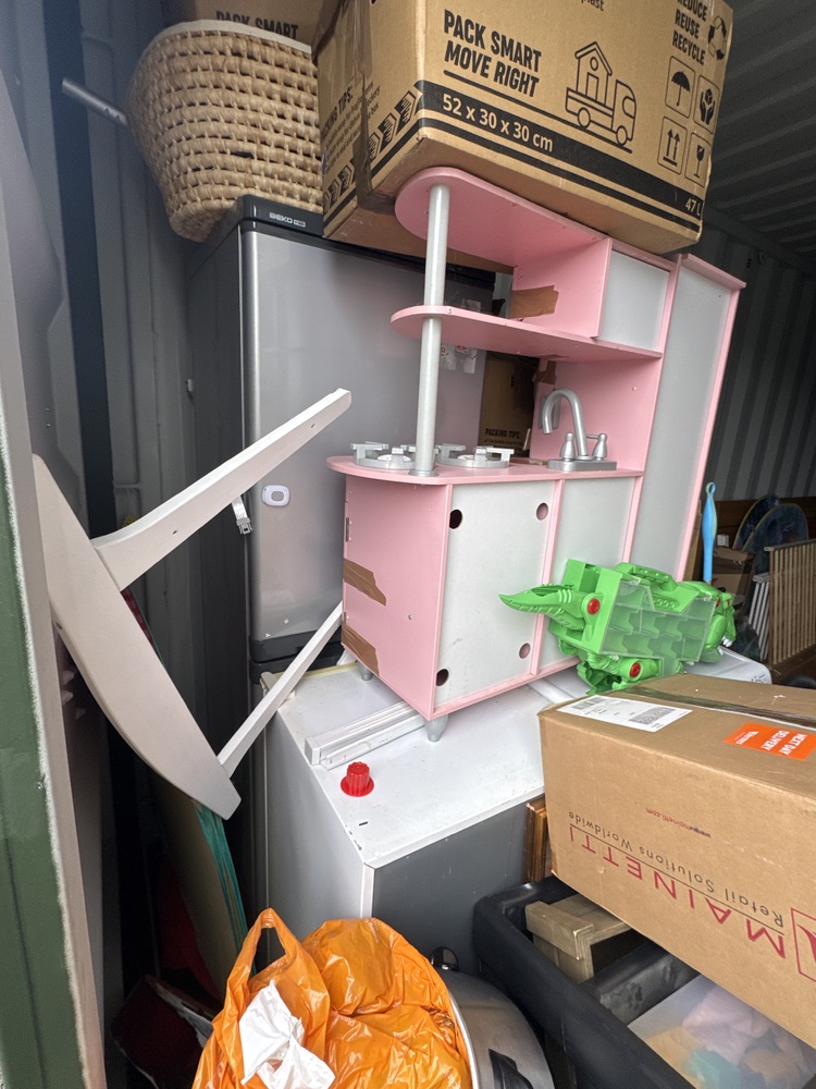 Auctioning the full contents of a storage container offering a varied mix of household and leisure items. Included is a fridge freezer suitable for everyday use, a comfortable double sofa ideal for living rooms or rental properties, and a black leather chair adding a modern touch. There is also a children’s play kitchen, perfect for imaginative play and family homes. A guitar is included, suitable for beginners or as a spare instrument.