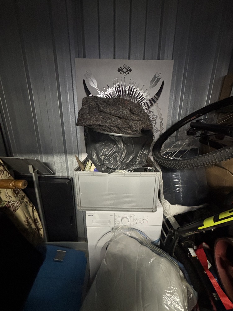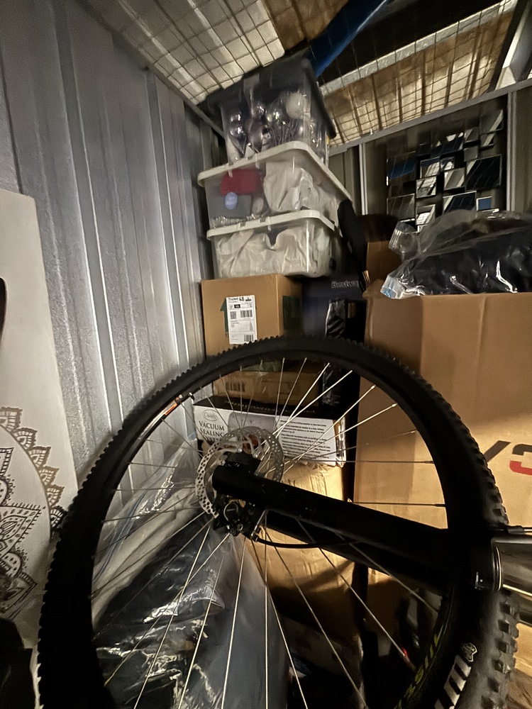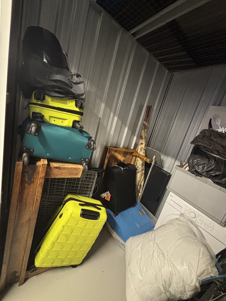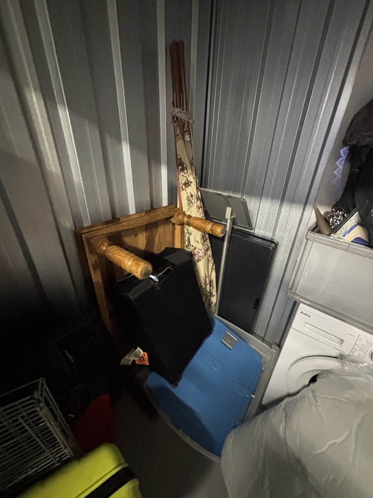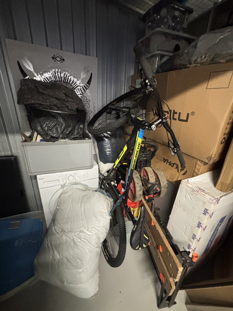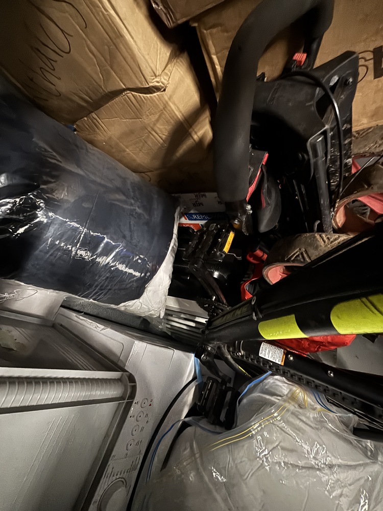 washing machine, multiple suitcase full of clothes. wooden table. mountain bike. computer monitor. fish tank, boxes of household, bedding, Christmas decorations