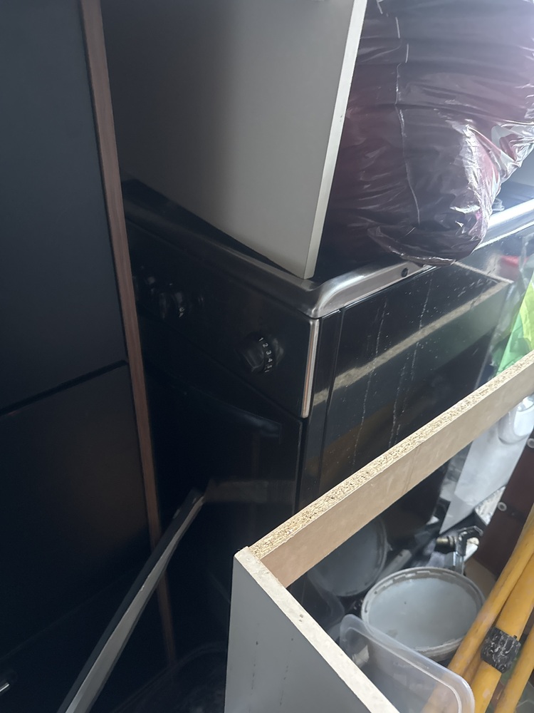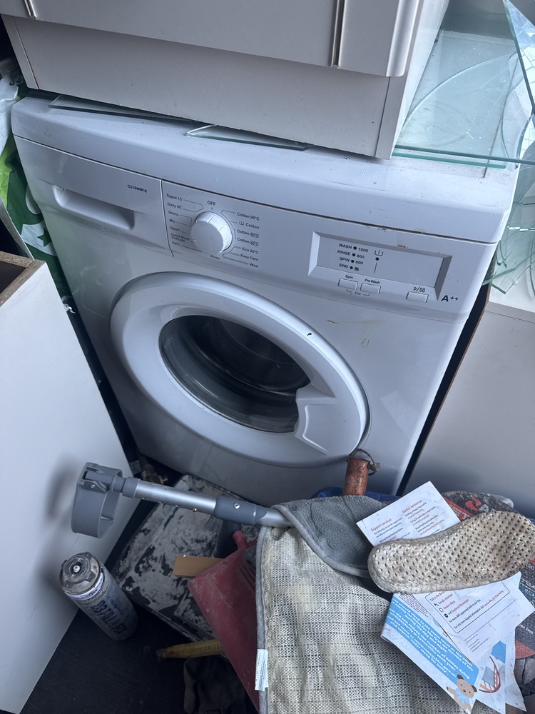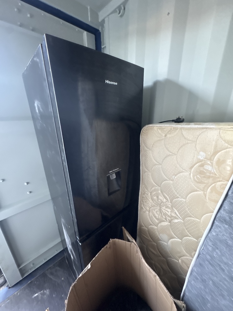 Auctioning the full contents of a storage container sold as one lot. Items include a fridge freezer, chest of drawers, washing machine, and cooker, along with a double bed and mattress. Also included is a selection of various tools suitable for DIY, home maintenance, or workshop use.