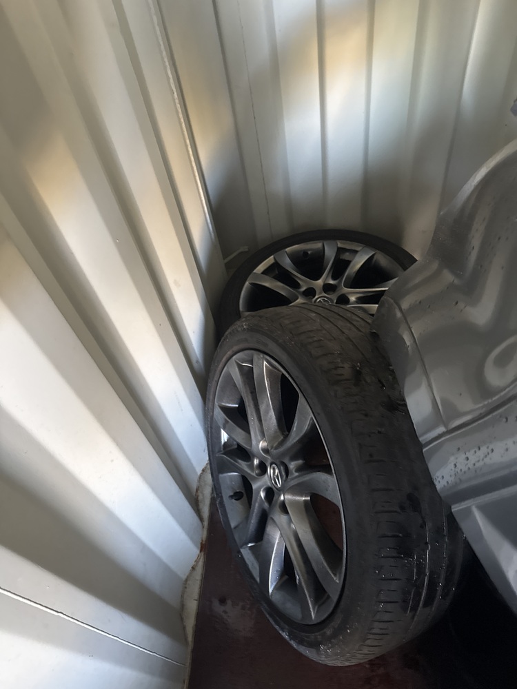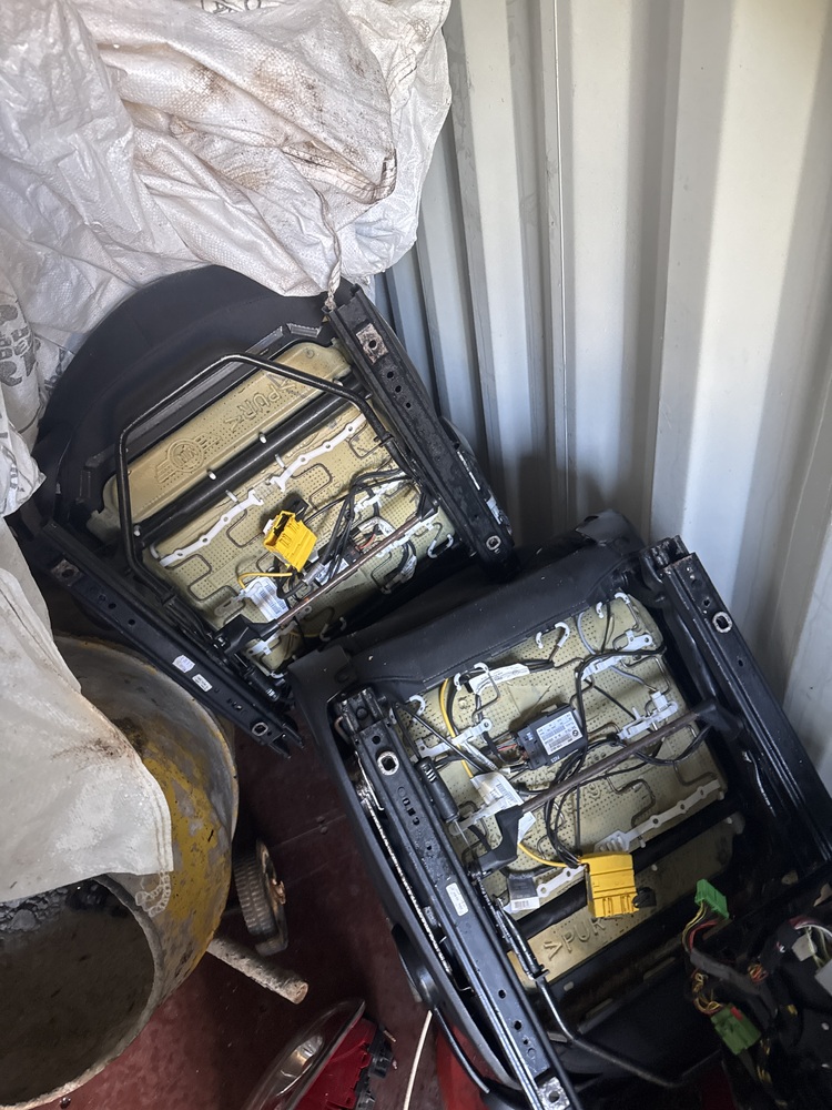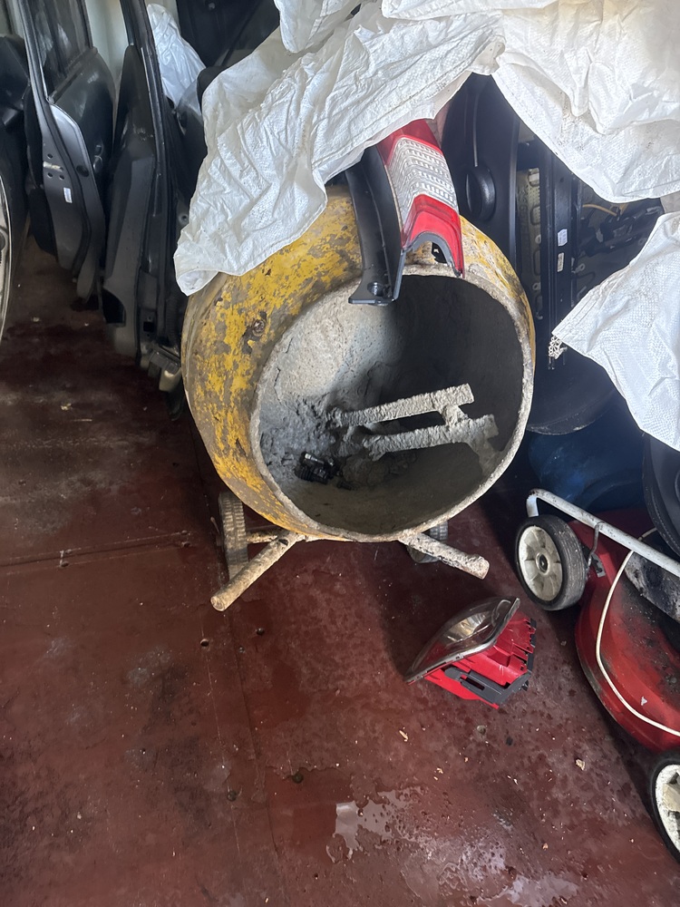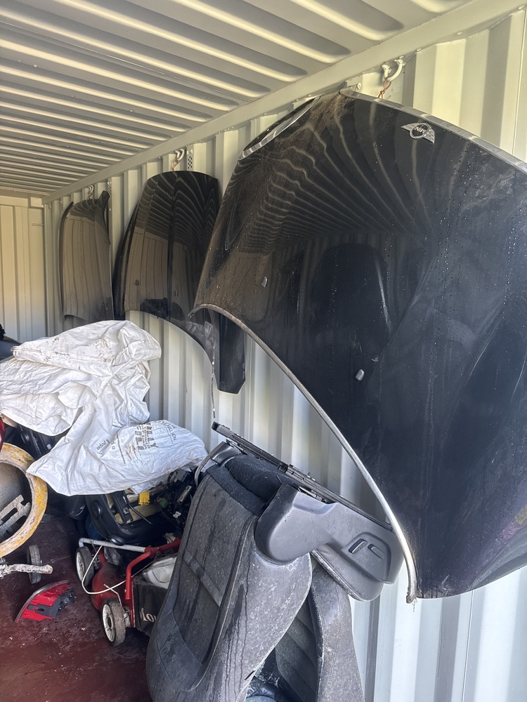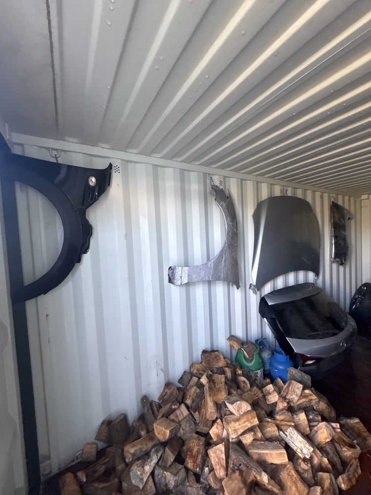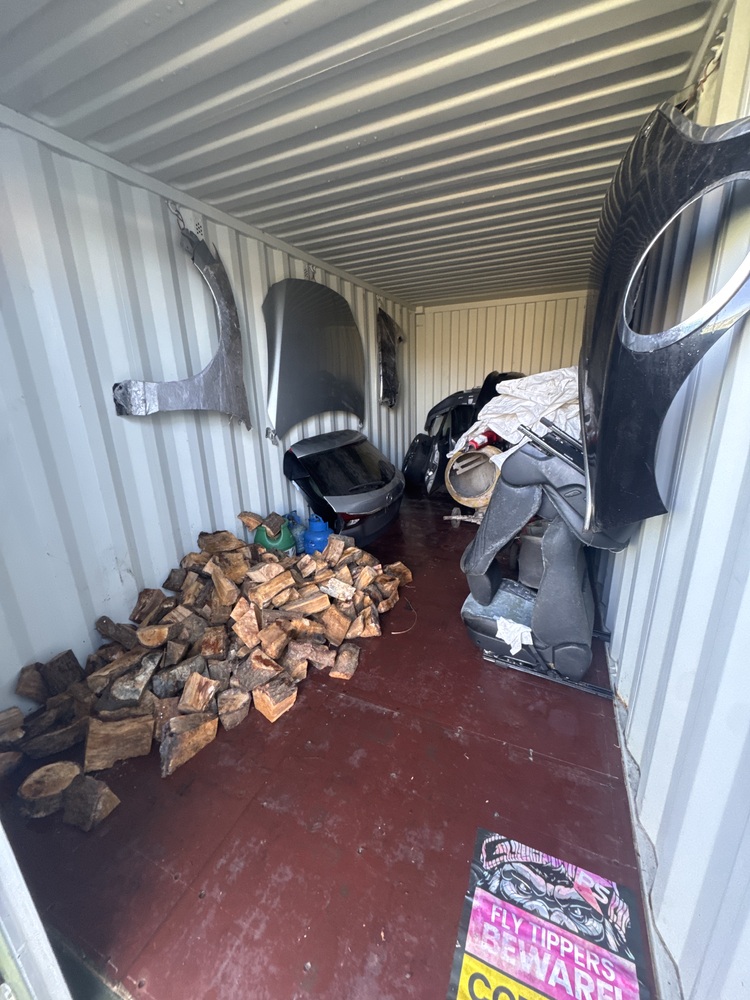 Auctioning the full contents of a storage container sold as one complete lot. Items include a selection of car parts and vehicle seats, ideal for spares or refurbishment projects. Also included is a cement mixer suitable for DIY or building work, along with a lawn mower for garden maintenance. A quantity of firewood is stored in the unit, useful for log burners or outdoor fires.