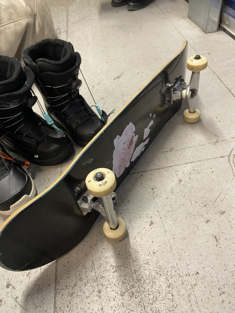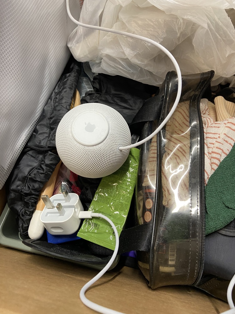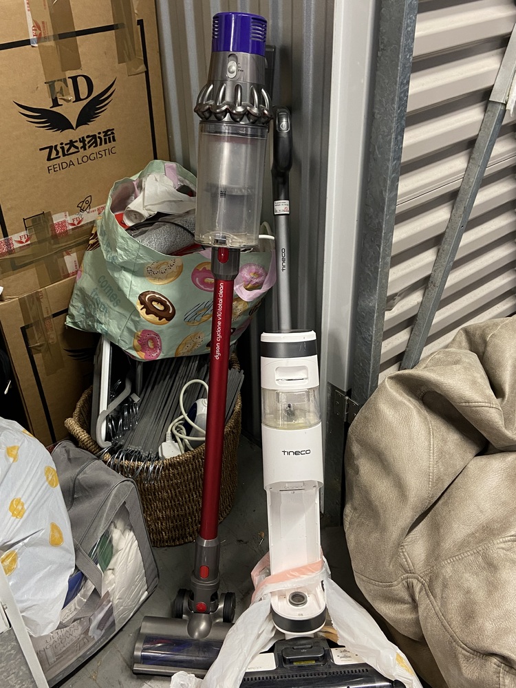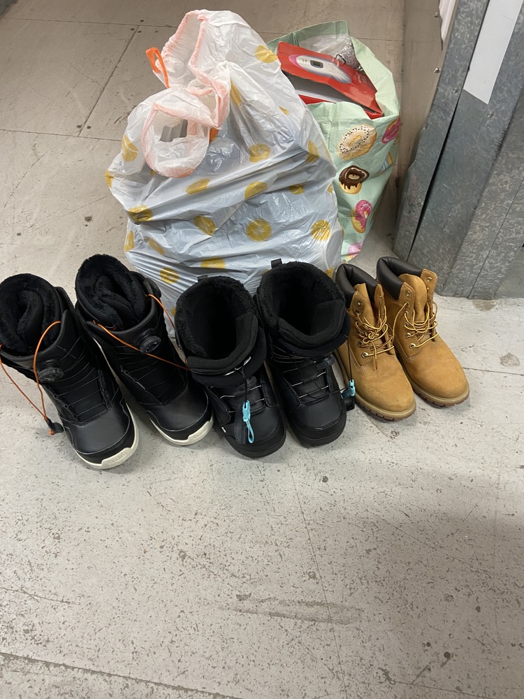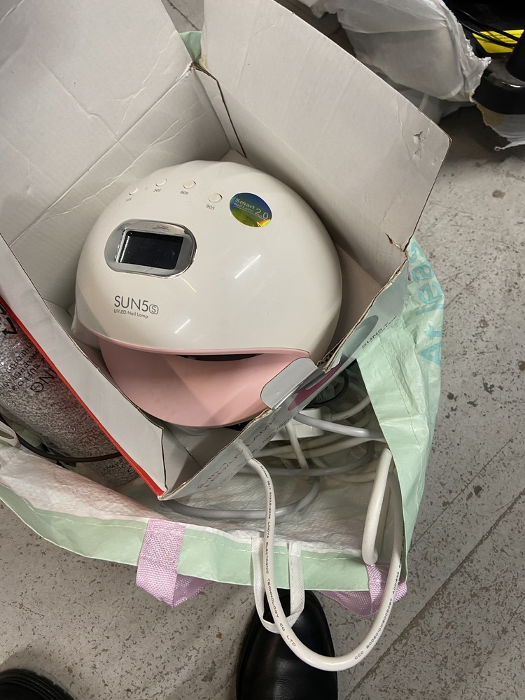 Leather bean bag, Dyson cyclone V10, nail lamp, skateboard, snowboarding boots x2 (size 6), Apple mini speaker, and other items