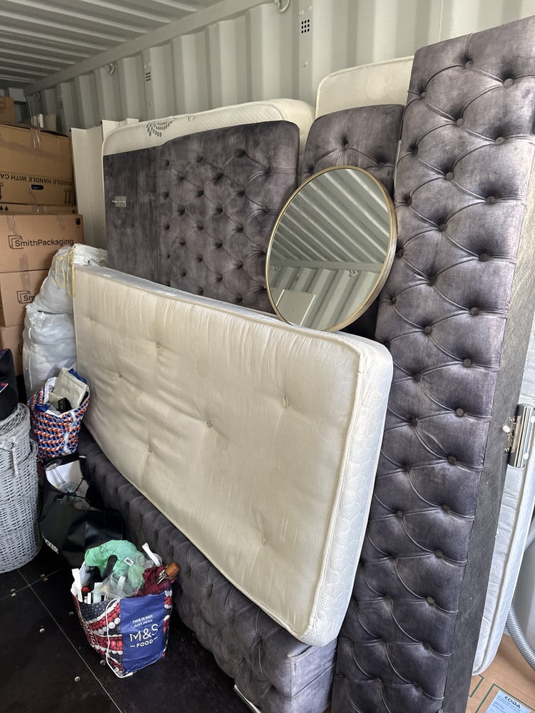 Auctioning the full contents of a storage container offered as one complete lot. Items include a microwave, hoover/vacuum cleaner, double bed frame with mattress, and two televisions. Also included are various storage units suitable for home or garage use, along with multiple boxes containing mixed household goods.