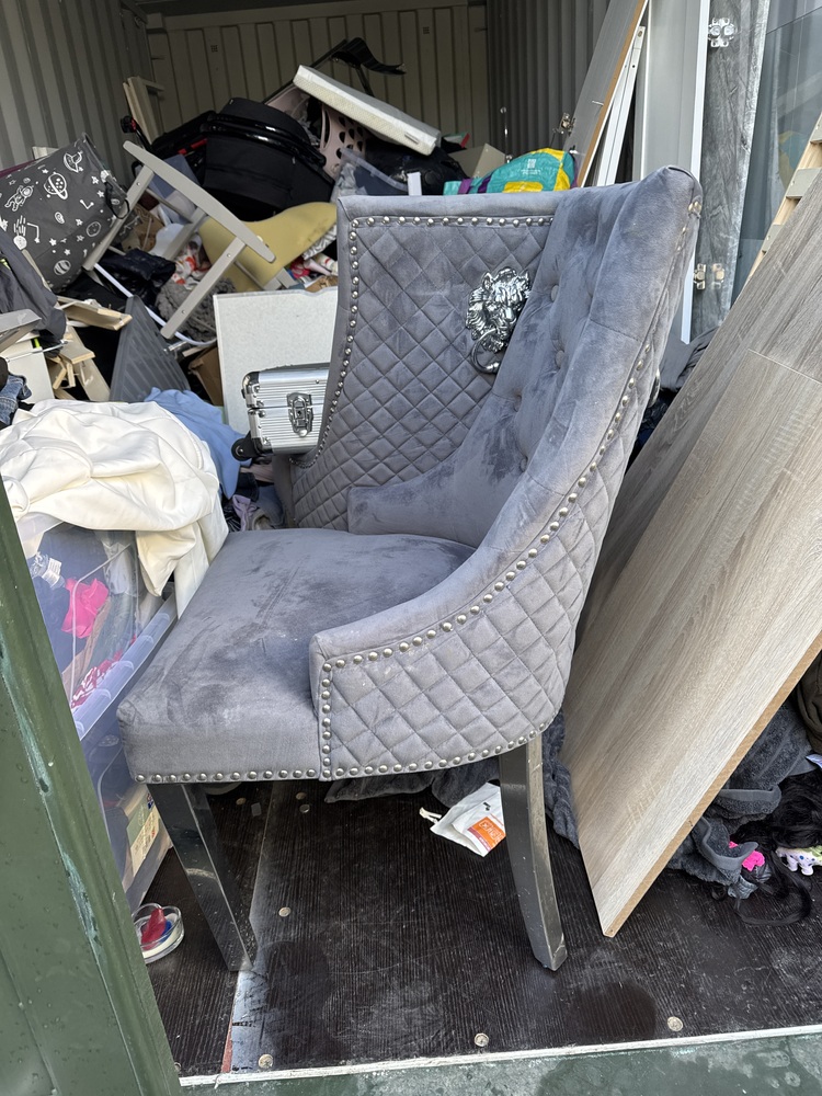 Auctioning the full contents of a storage container sold as one lot. Items include two grey fabric chairs in good used condition, a chest of drawers suitable for bedroom or general storage, and a black leather office chair ideal for home or workplace use. Also included is a quantity of various clothing, stored in the unit and offering potential resale or personal use value.