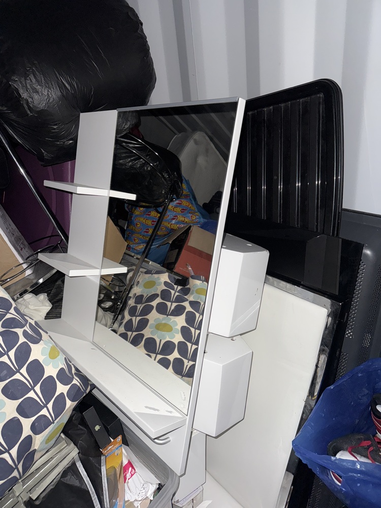 Auctioning the full contents of a storage container sold as one lot. The container includes a television, assorted shelving units ideal for storage or workshop use, and multiple mirrors of varying sizes. Also included is a microwave suitable for home, office, or rental use, along with a divan bed base offering practical bedroom furniture. Items appear suitable for resale, personal use, or refurbishment.