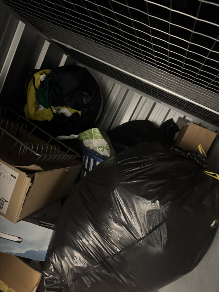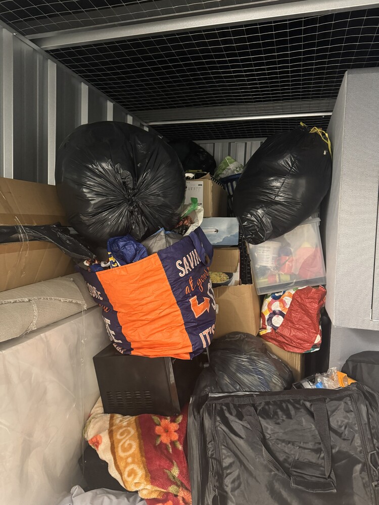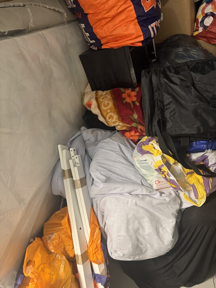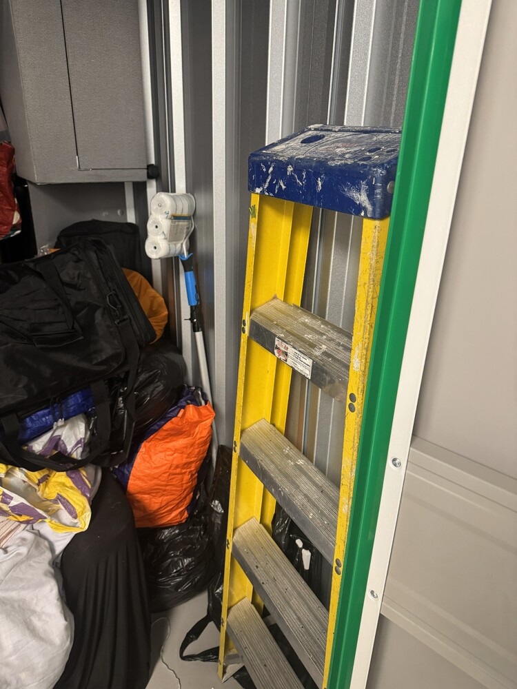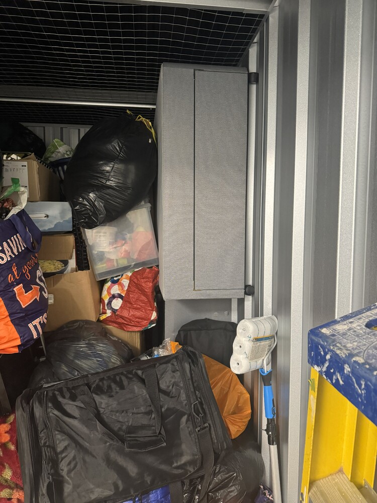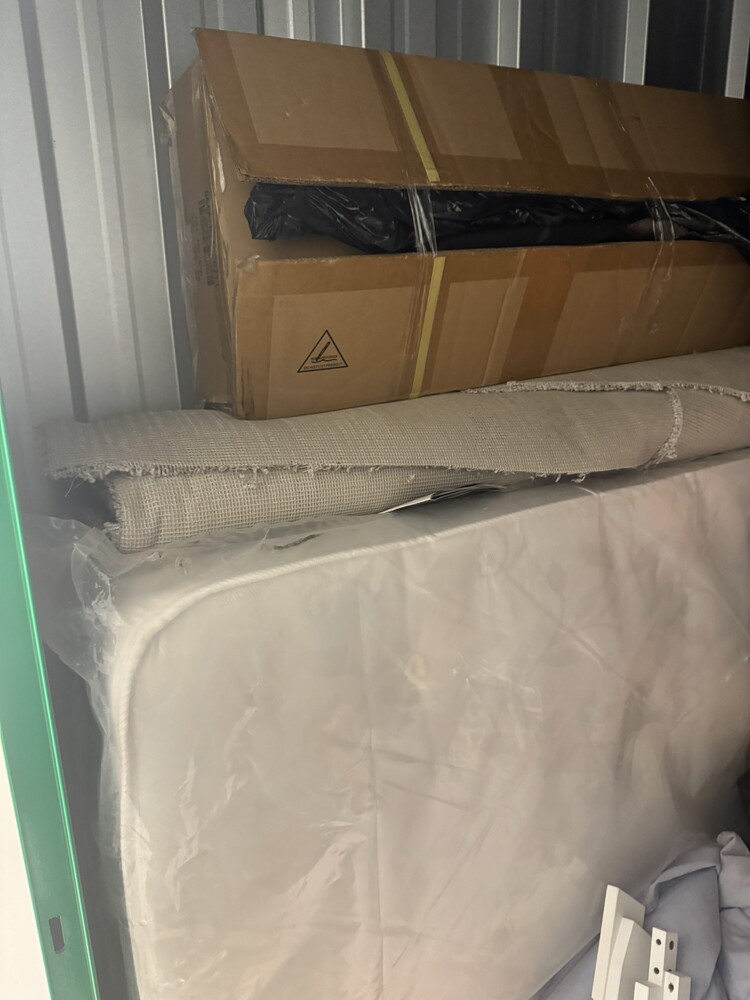 50 sqft unt available, full of household items, including but not limited to, Decorating equipment, step ladders, divan bed frame and mattress, microwave and various items in boxes and bags