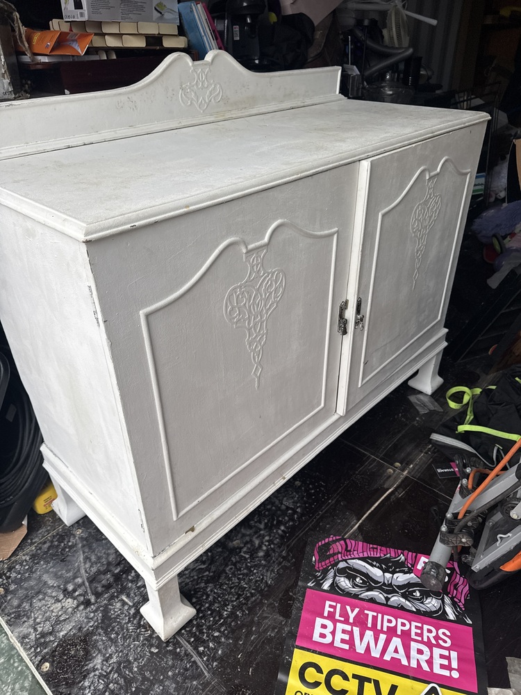 This storage container is being auctioned as a single lot and contains a varied selection of household and fitness items. Included are two wooden cabinets suitable for storage or display, a tall shelf cabinet offering additional vertical storage, and a sturdy table. The contents also feature a weight bench, ideal for home fitness use, along with several mirrors of assorted sizes that could suit domestic or commercial settings. Multiple hoovers are present, making this an appealing lot for resale, refurbishment, or personal use.