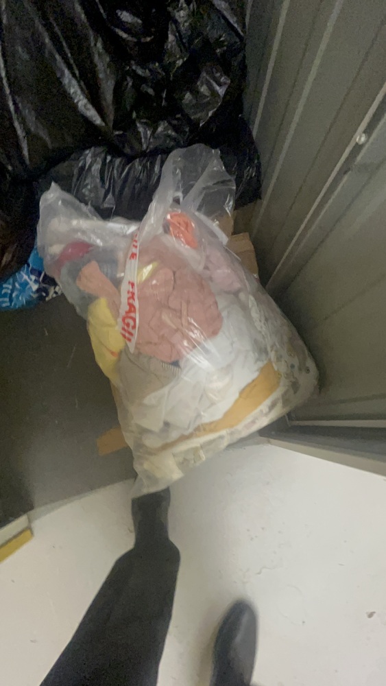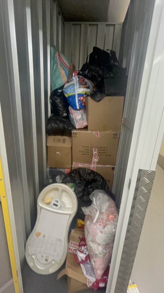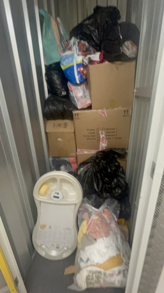 Unit has a lot of baby items. Baby bath and baby clothes. A lot of boxes and bags of clothes. Also books.
