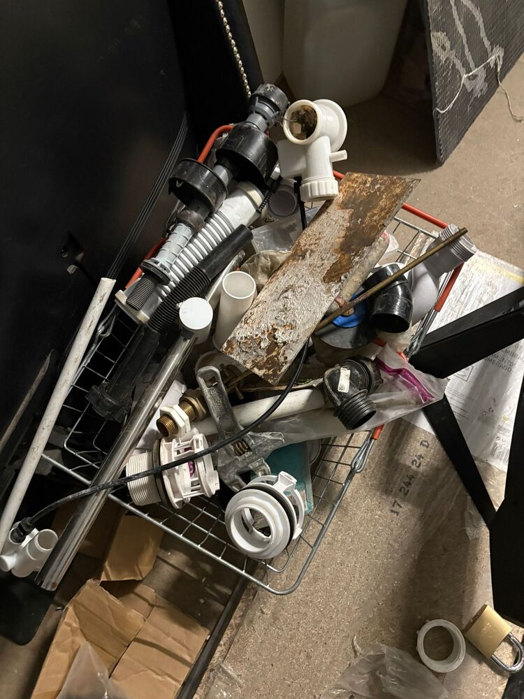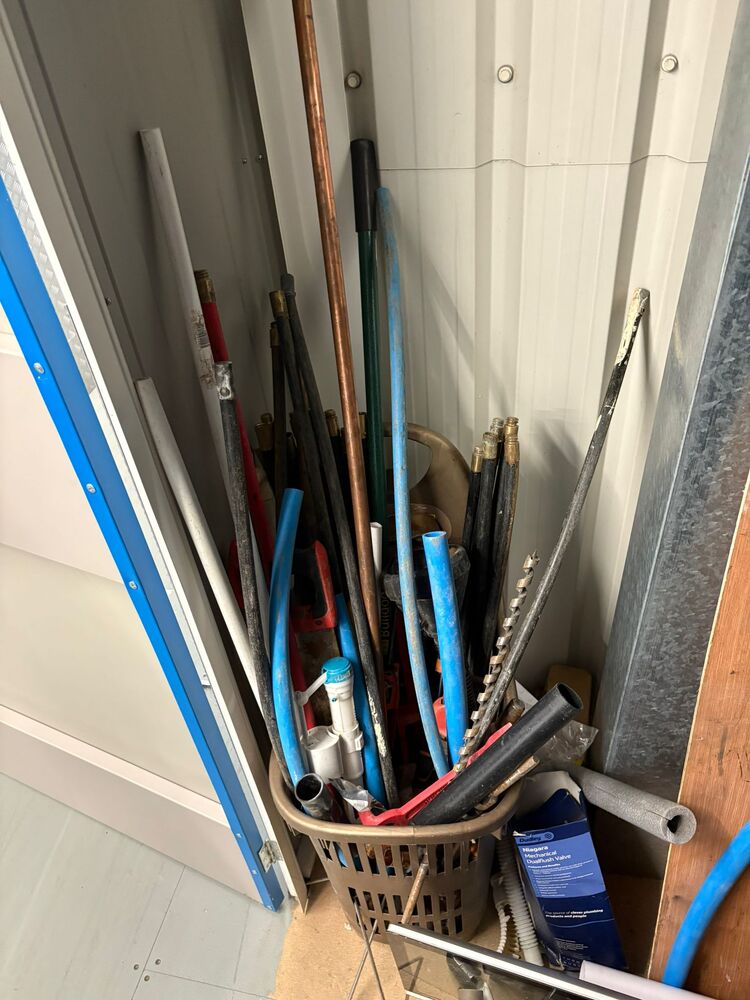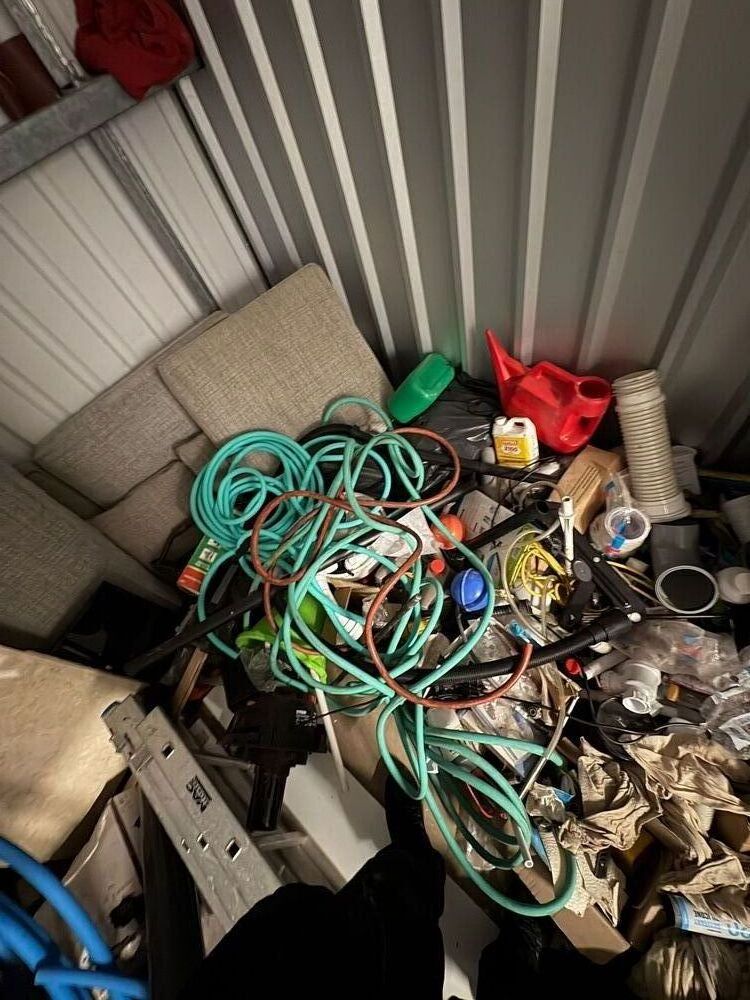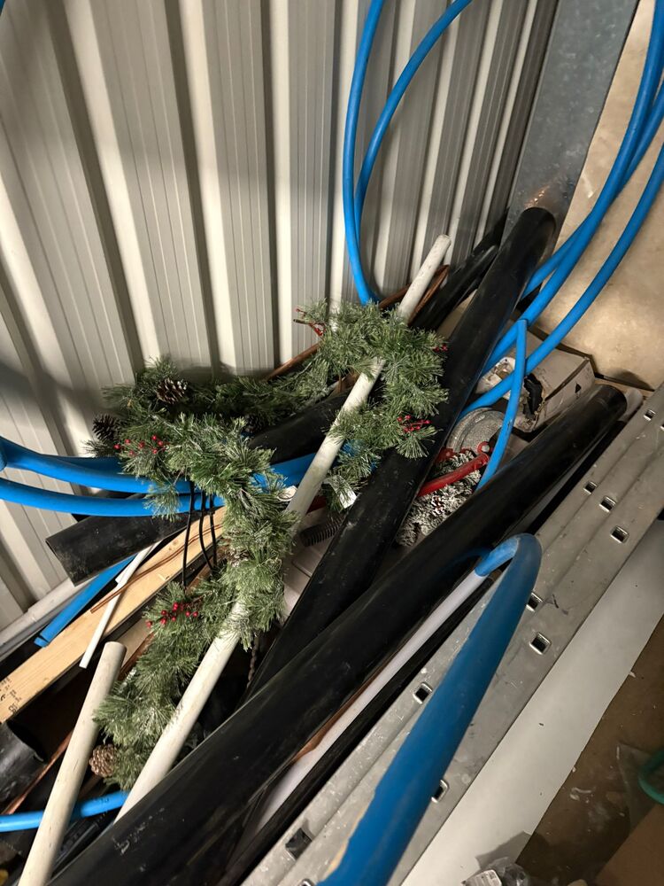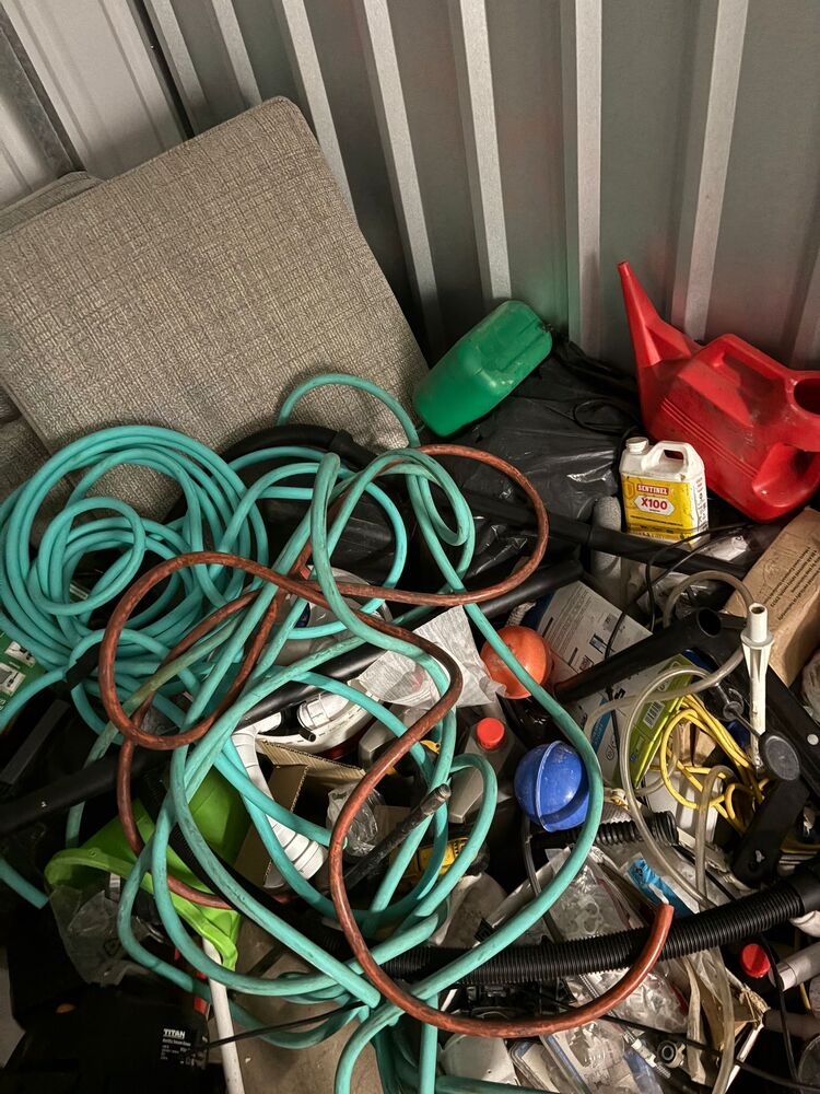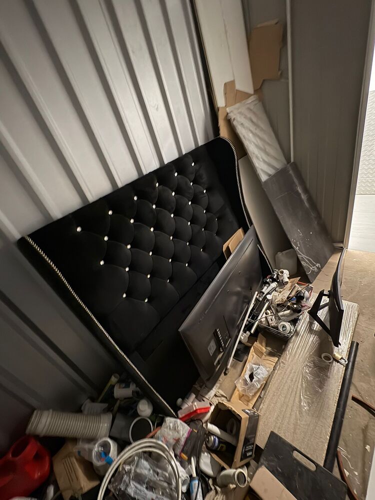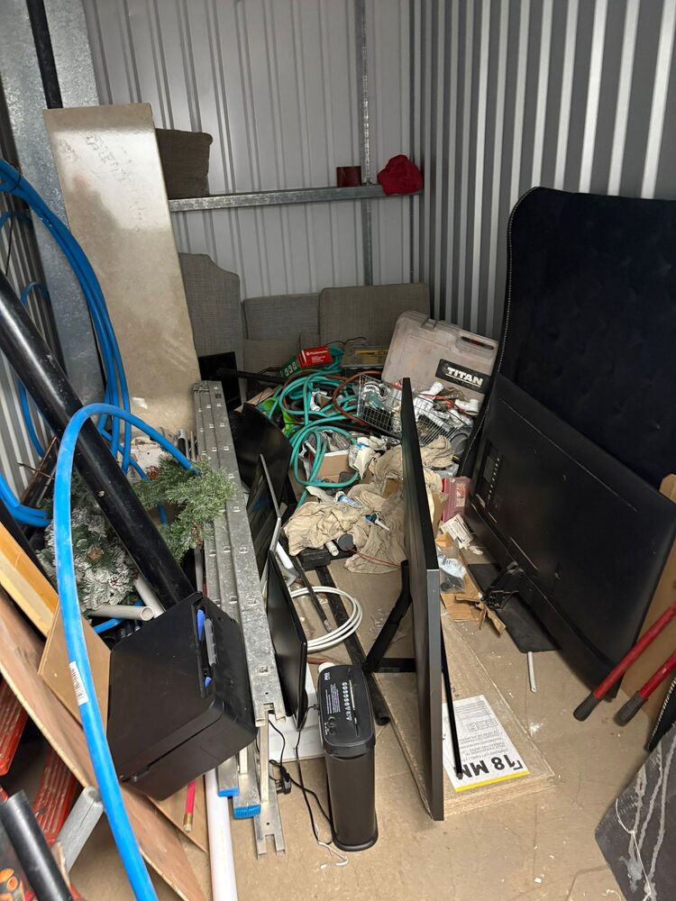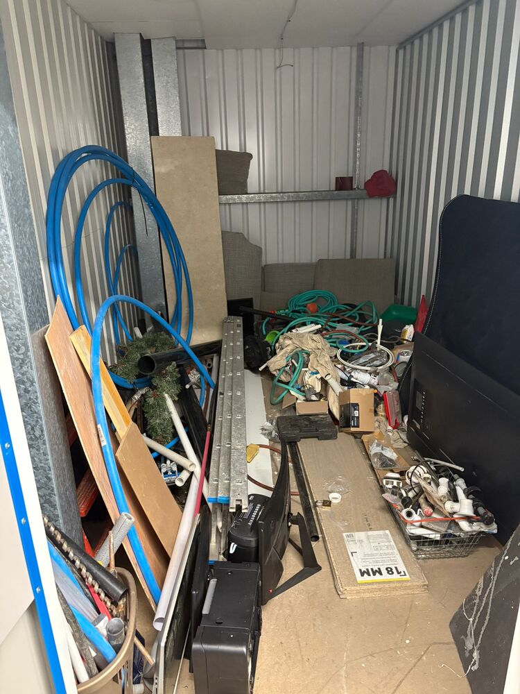 100 sqft unit with a mix of work items and home stuff. noticeable items being Tv, monitors and various tools and pipes