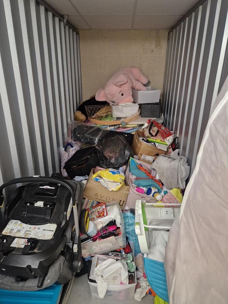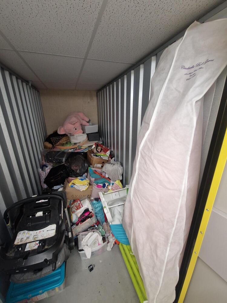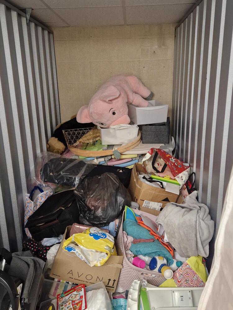 The Unit has what looks like a pram, either a wedding dress/prom dress, boxes, bags, suitcases and soft toys.