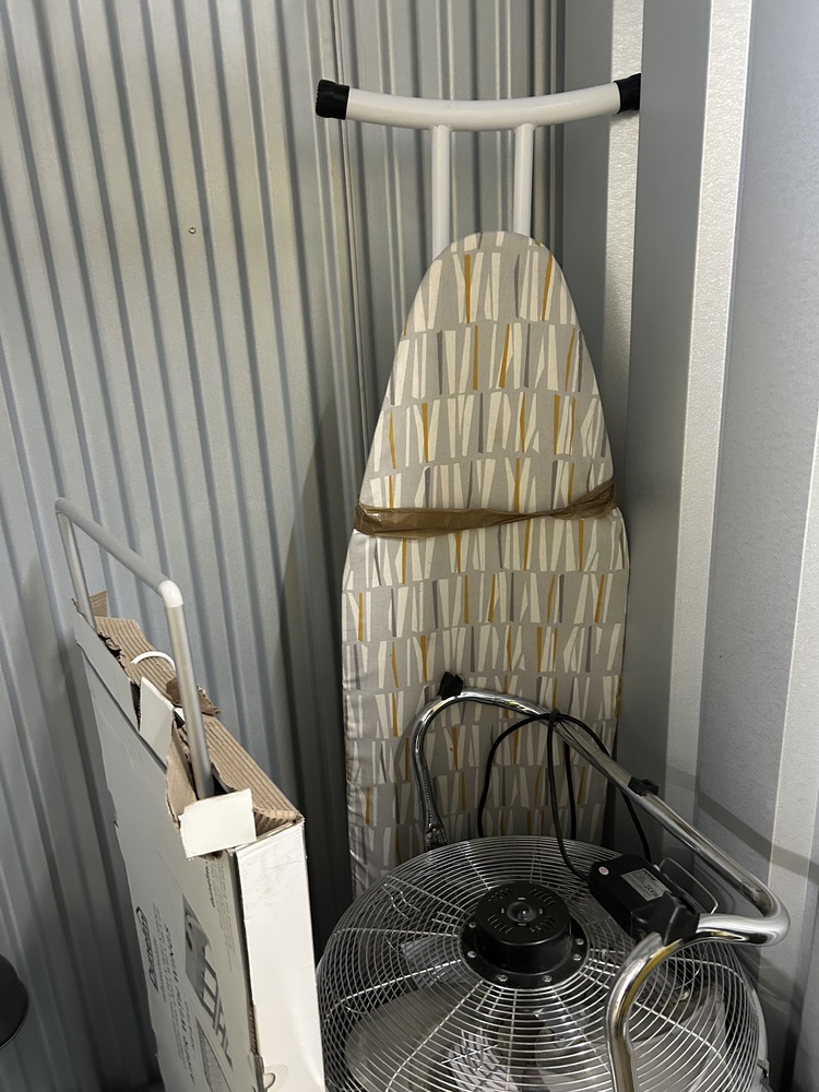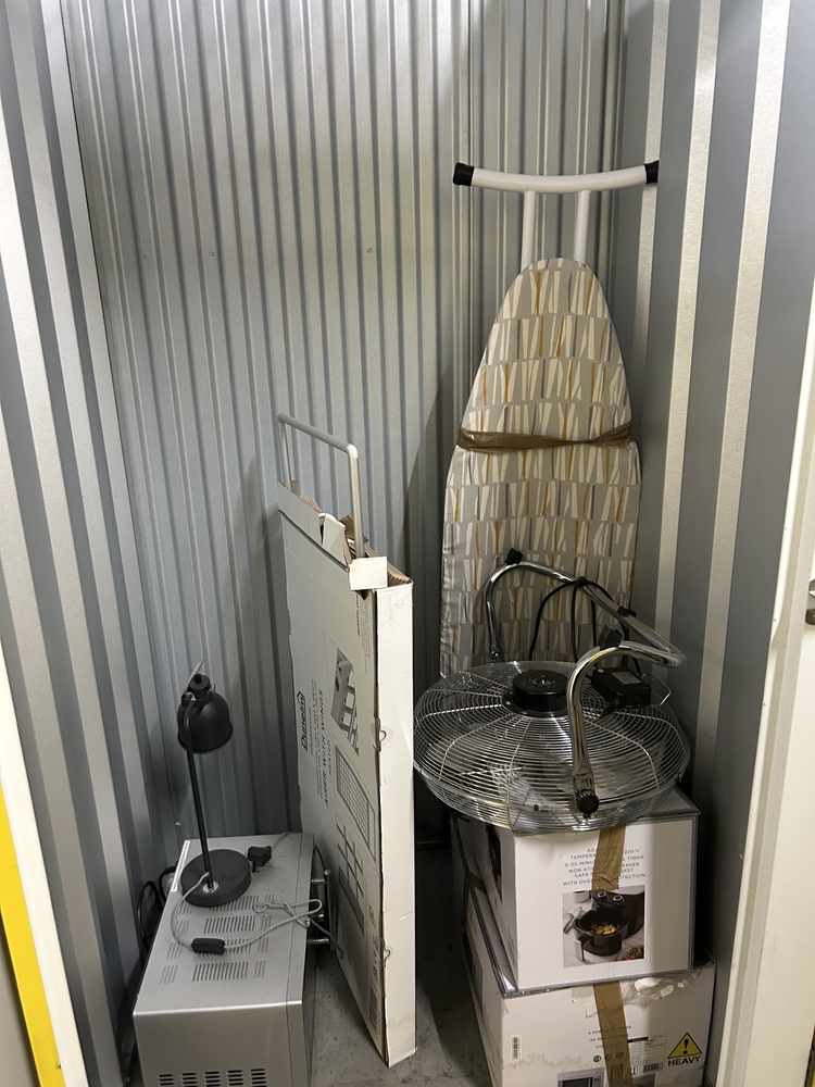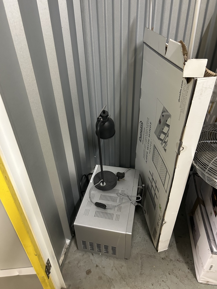 This unit contains two boxes of personal belongings and personal items, One electric fan, one ironing board, one microwave, one desk lamp and one heated airer.