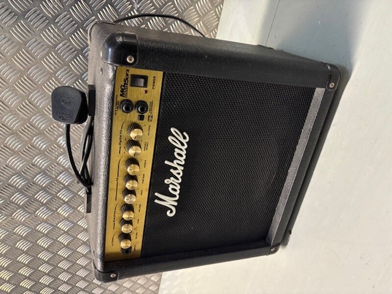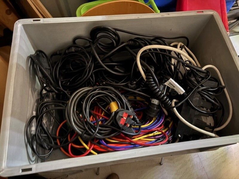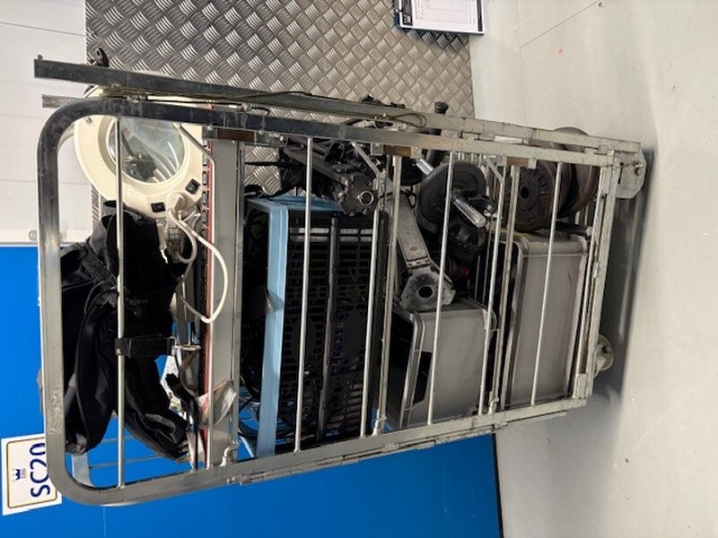 • Large metal trolley with miscellaneous weights & electrical equipment