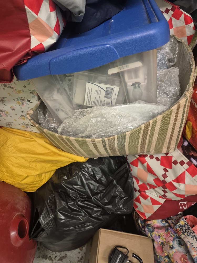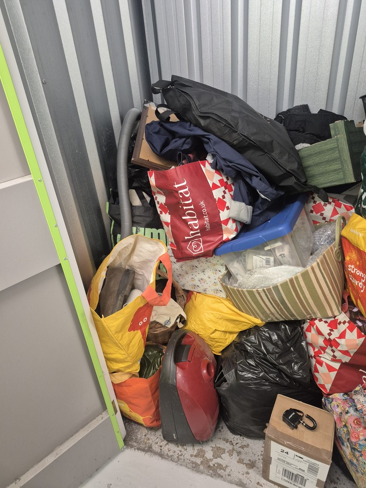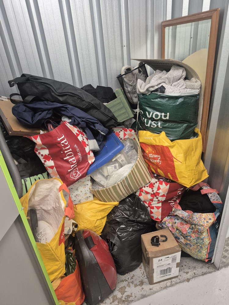Unit appears to contain clothes, several boxes, various bags, a small hoover and a large mirror. May contain other items in bags not in sight.