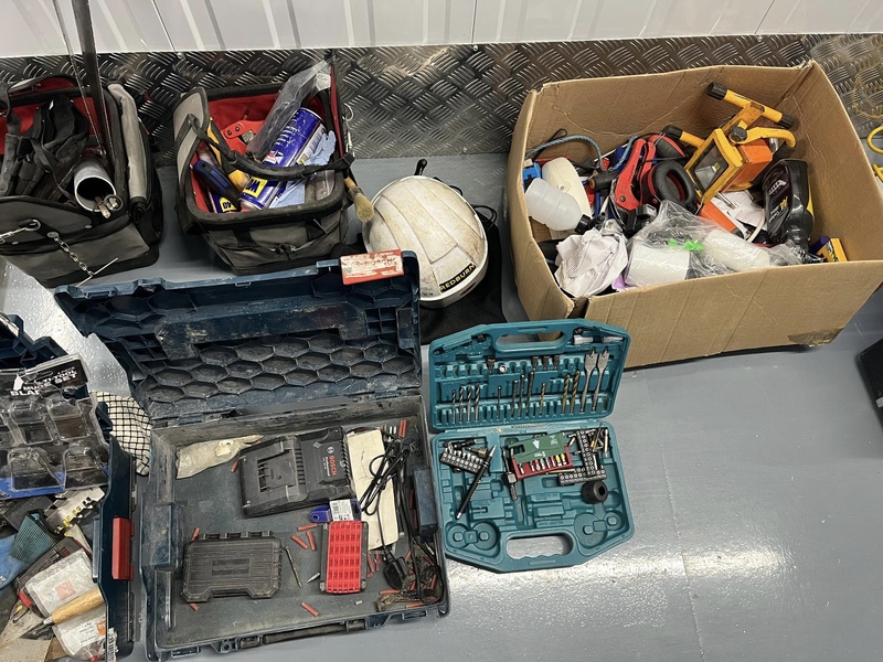 Approximately 8-10 tool boxes containing hand tools ,screws, staple guns,saws,tape measures,torch etc