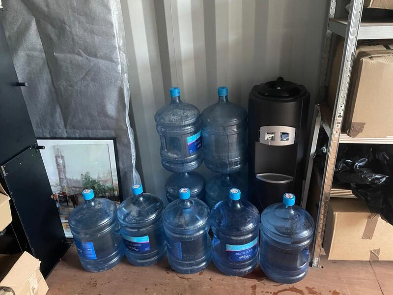 Various office equipment inc: HP Printer, Water Dispenser with 2 bottles. lots of various desks/tables and chairs